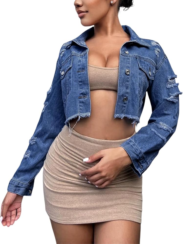 Features:Women cropped denim jean jacket coat,cute denim jacket for women and girls,stand collar,crop top jean jackets,button closure, washed,turn down collar,classic fit,long sleeve.