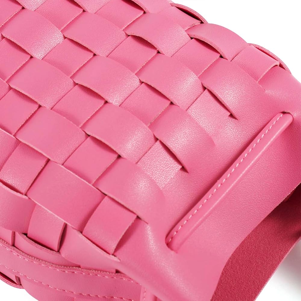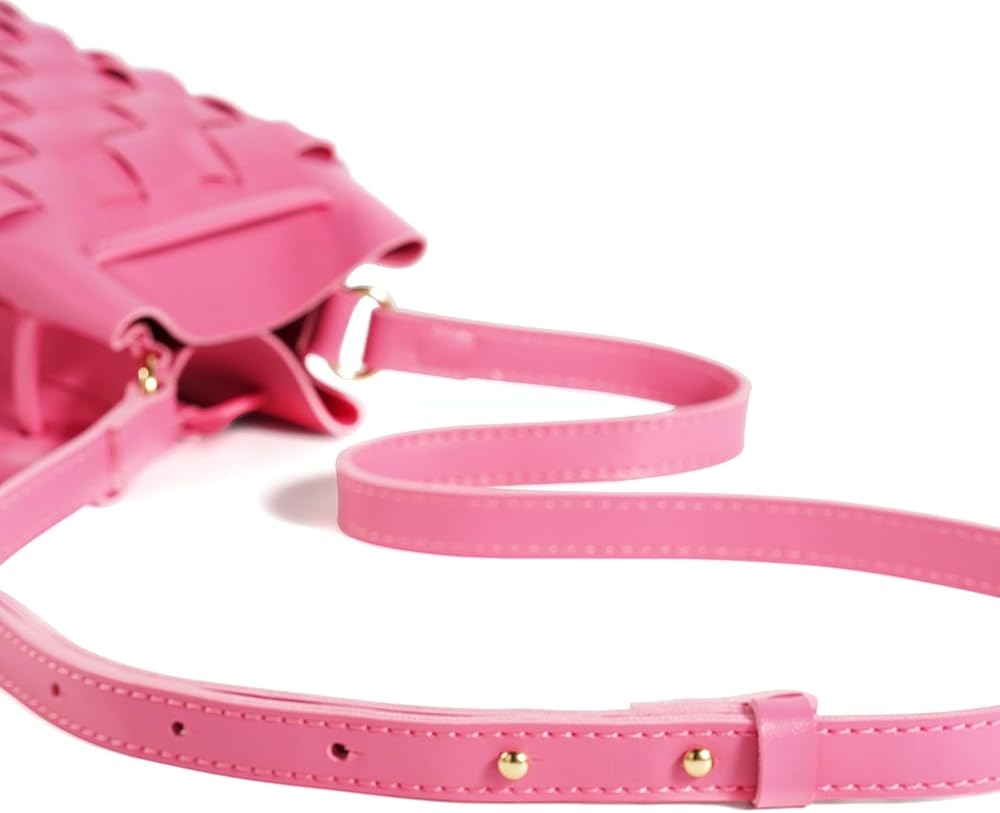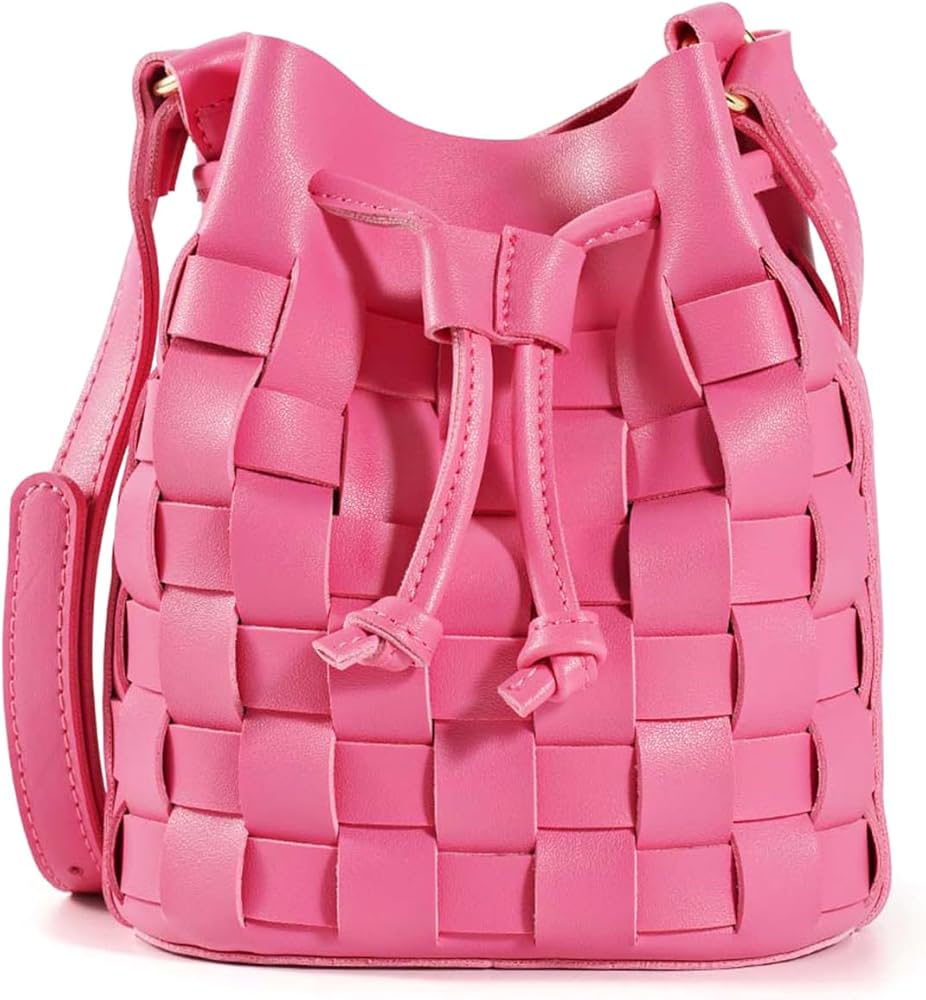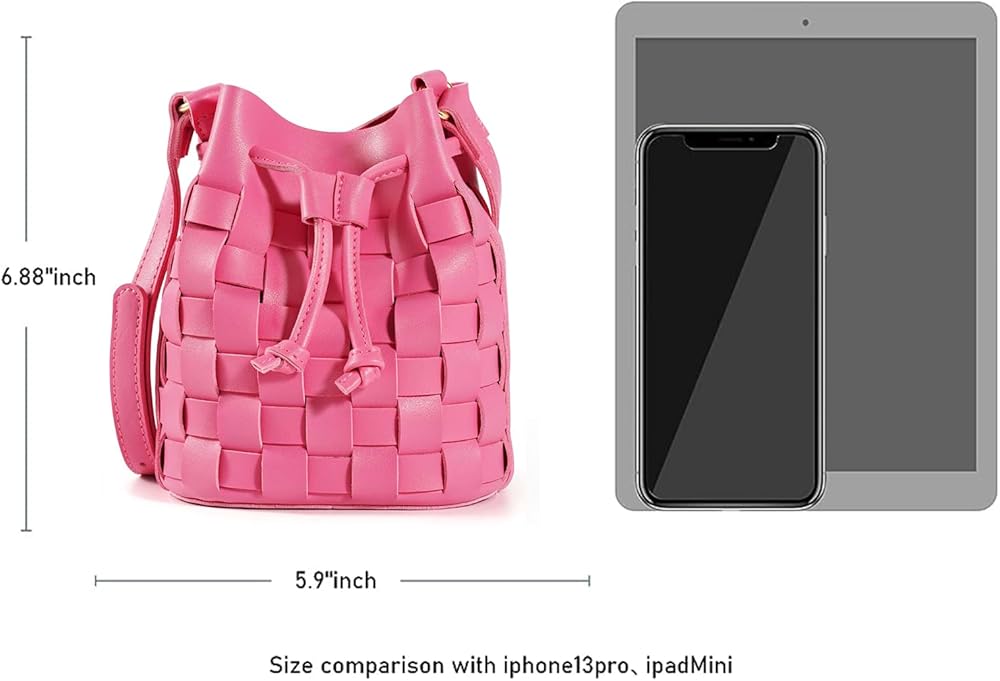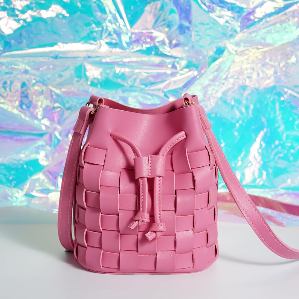 [90's Design Trendy]-The bucket bags made with wide single face vegan leather strips in an orthogonal weave. The single detachable interior canvas drawstring pouch,it featuring the drawstring closure. Adjustable shoulder strap folds inside the bag to carry as a clutch.