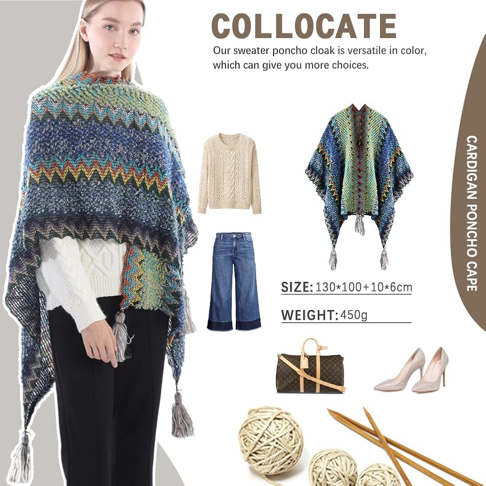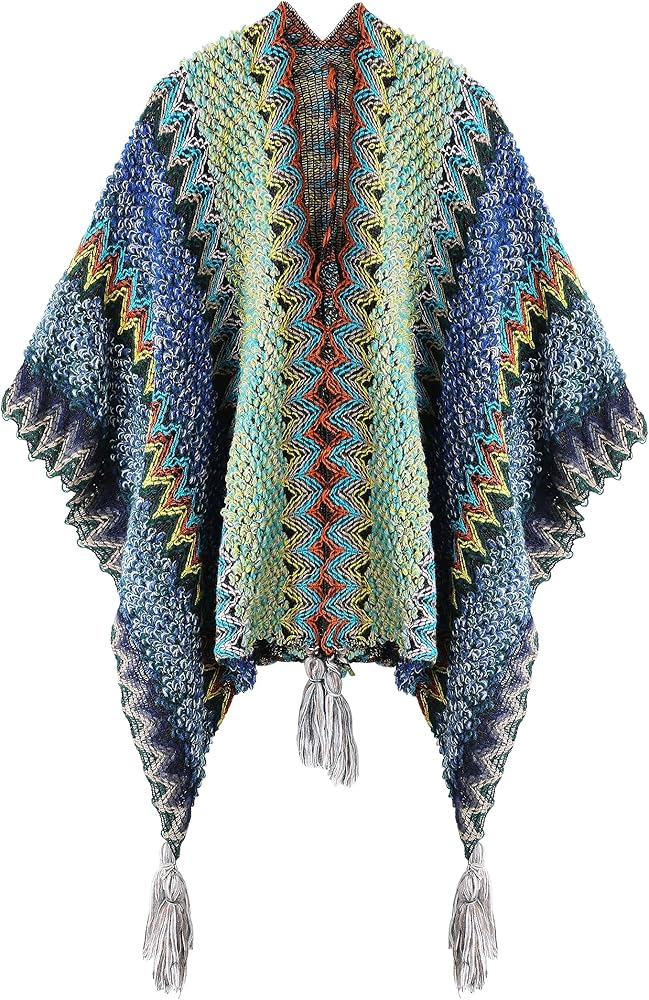 WELL- DESIGNED: With the theme of bohemian style, BOCOSO's designer uses thick knitted weave pattern, bright and stylish. Super cozy oversized women's ponchos and wraps, open front poncho cape design, throw it on your shoulder, free arms, with delicate fringe and make your look vibrant.