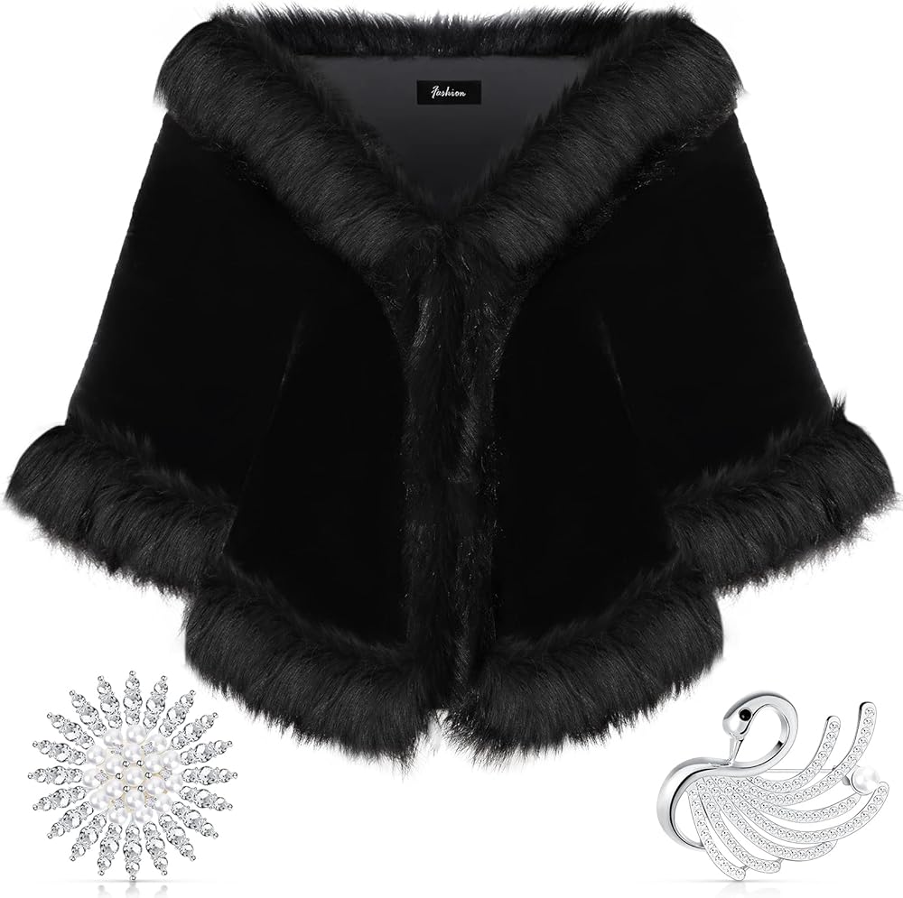 Material: this winter bridal wedding shawl is made of thick and soft artificial fur, bringing you a warm and comfortable feeling, the same material is applied inside and outside, making it fluffy and luxurious; Exquisite brooches made of alloy are very suitable for decorating our shawl or make different crafts