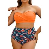 Plus Size Two Piece Bathing Suits: Two piece plus size swimsuit for women features twist-front bandeau bikini top and high waist bikini bottom to make you look cute and flattering.