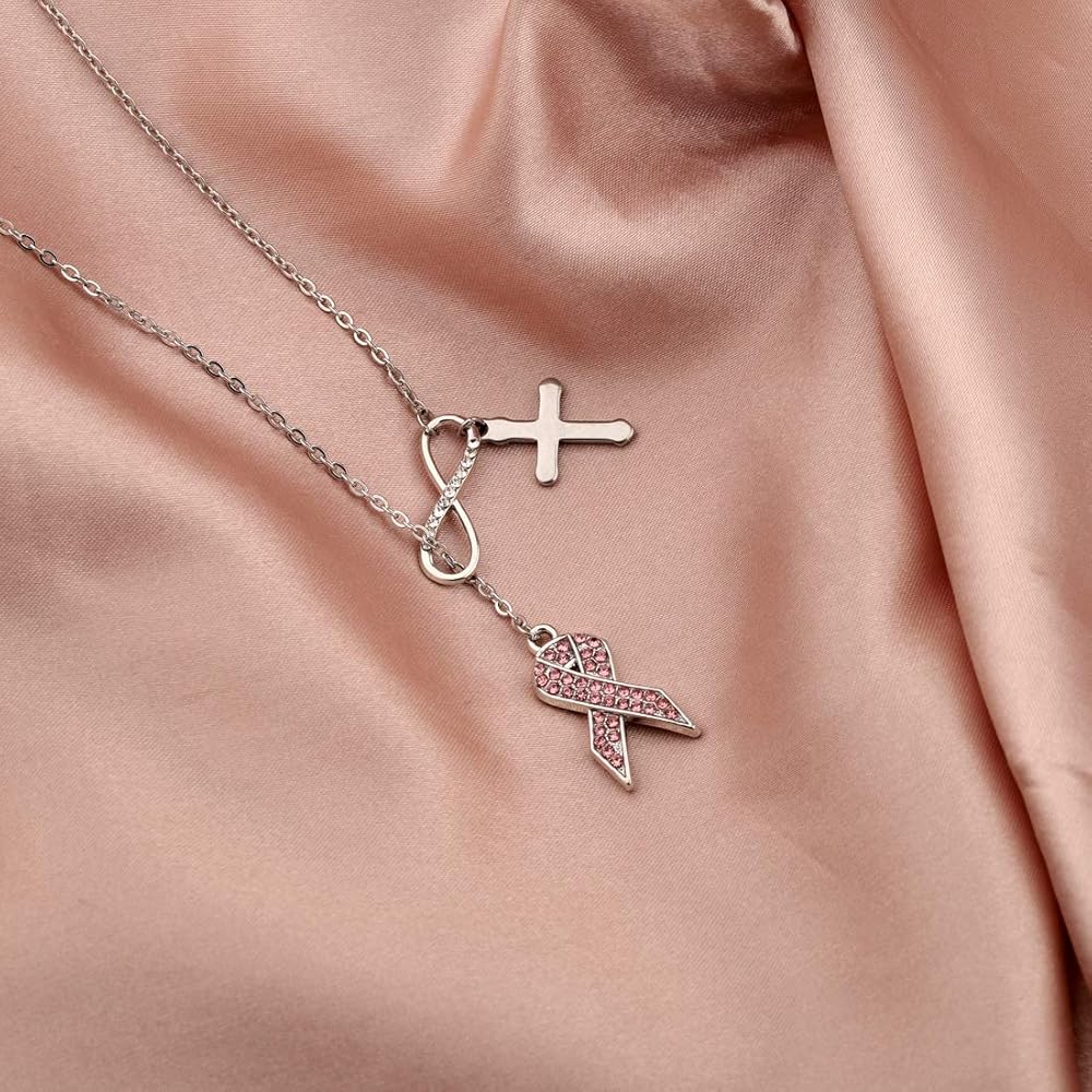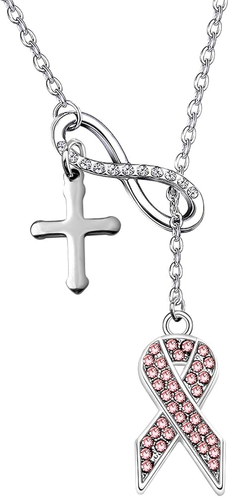 A beautiful Y necklace with infinity love symbol, cross and pink ribbon charm, perfect cancer fighter gift for Christian Women Girls.
