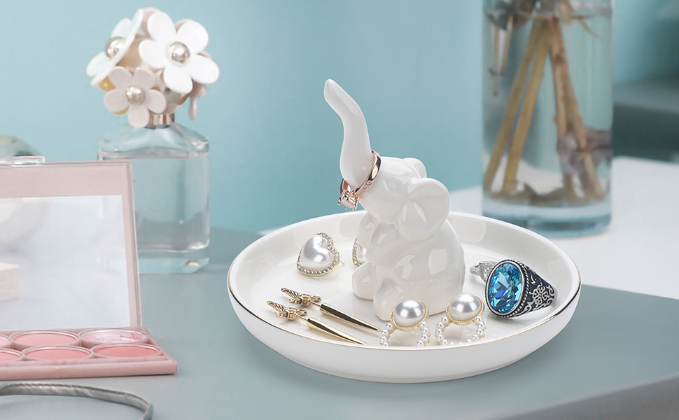 UNIQUE GIFT IDEA - The cute elephant ring holder for women , family, friends, co-workers, or any special person you love to show your concern and love for them, also as jewelry storage box engagement gift, so that your relationship will be enhanced.Not just a jewelry tray dish, but also a beautiful home decor, white elephant gifts. They will appreciate your choice this ceramic trinket dish. It is said that elephants bring good luck.