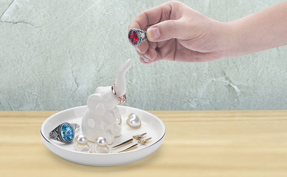 HIGH QUALITY MATERIAL - The elephant ring holder jewelry is made of high quality ceramic with white box,strong and durable, easy to clean.A great way to showcase and organize your rings, necklace, hand chain, bracelets, earrings and other miscellaneous jewelry pieces.