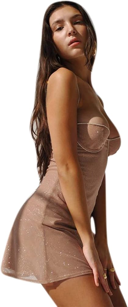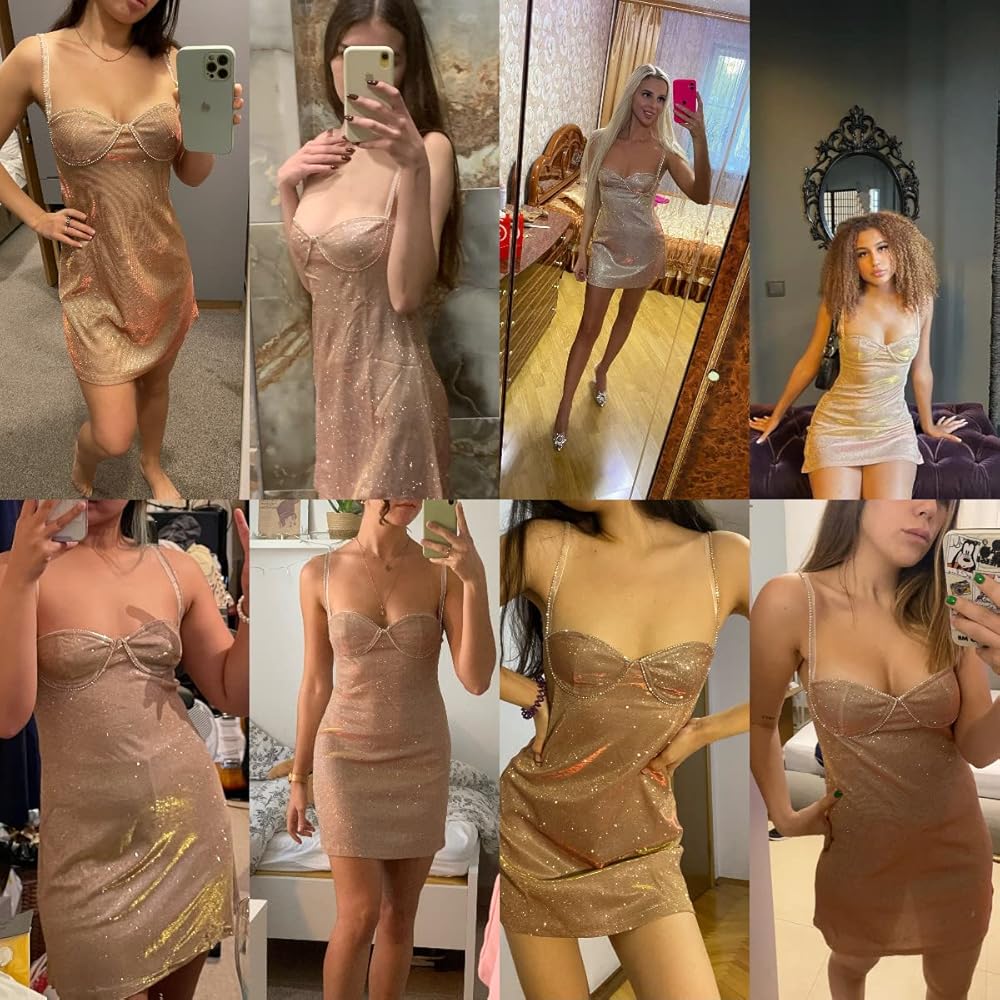 Women's Sexy Glitter Spaghetti Strap Bodycon Mini Dress Low Neck Sleeveless Mini Club Party Dresses
