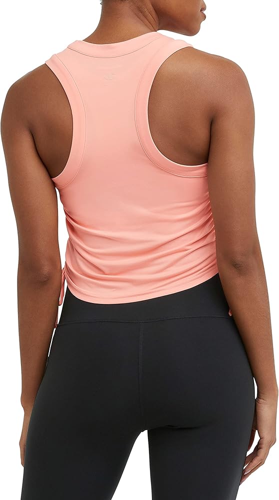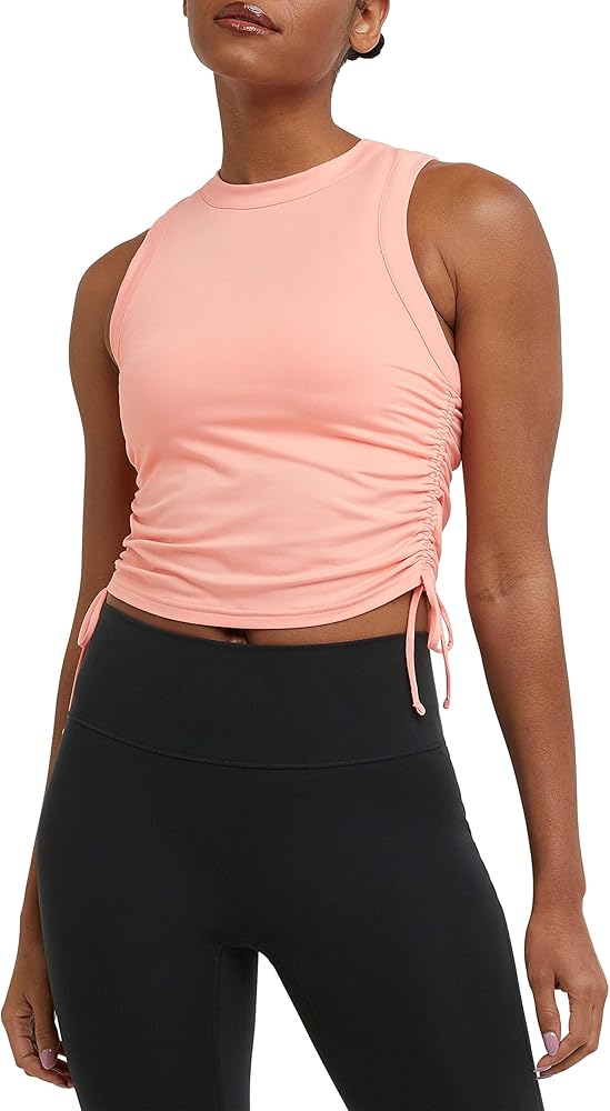 SOFT TANK MADE TO BE SEEN. Level up your lineup with our Soft Touch Ruched Tank, featuring elevated feminine details. This women's tank has ruched sides with drawstring that adjust for a customizable, flattering look. Built for versatility from studio to street, this tank is made from a spandex blend that's double-brushed for extra softness. Moisture-wicking and odor-control properties help keep you cool and fresh all day. The tank is finished with a high neck, ribbed collar, and armholes, topped with the iconic C logo at the center back neck. This tank is as cute as it is functional.
