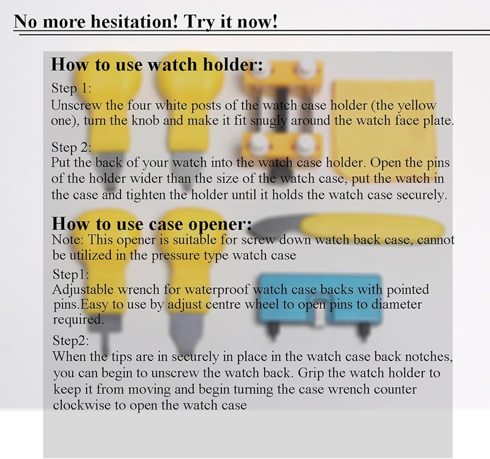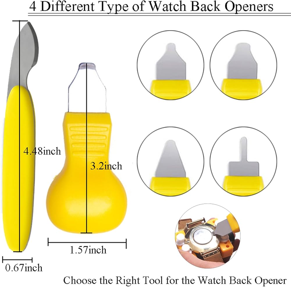 The watch battery replacement tool kit with adjustable tempered tips that adjust from 13 mm to 56 mm, and the watch case holder with 4 adjustable plastic pins that will minimize the risk of slipping and scratching.