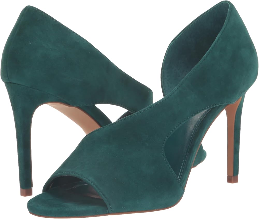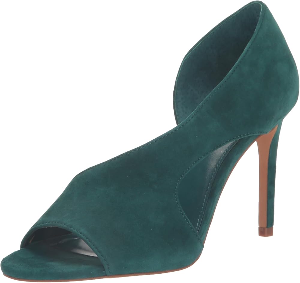 The Alinton d'orsay pump has open toe with a covered stiletto heel. Available in vibrant colored suede or glitter dusted, this heel works for business hours to after hours.