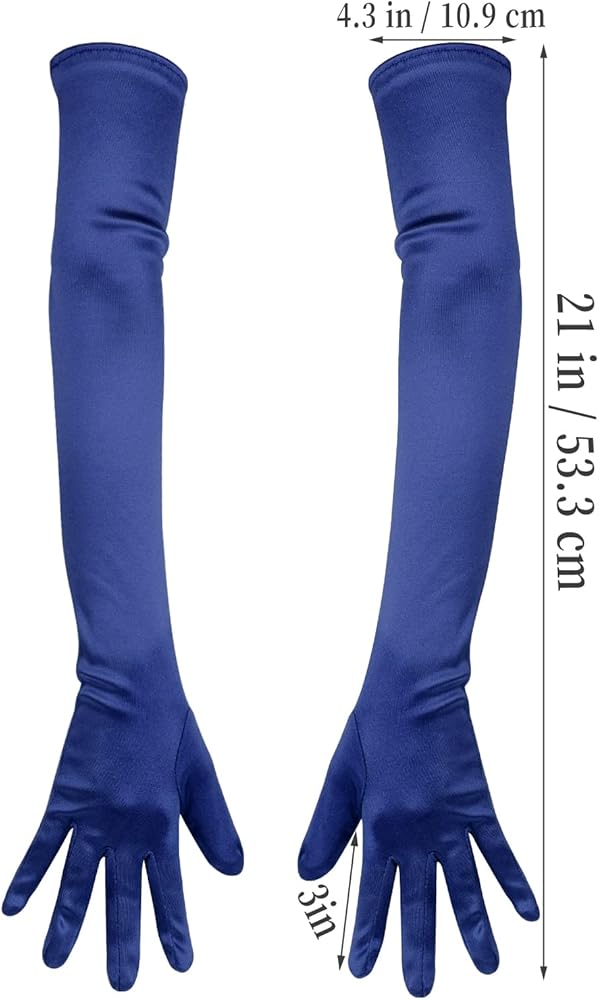 Package Content: You will receive a pair of satin gloves. They are about 21inch/53.3cm long from fingertip to the end, and the finger length is 3.2inch/8.1cm. Fit you hands perfectly and not easy to fall off. One size fits all with stretchy. They will not be too tight or loose. Comfortable to wear.
