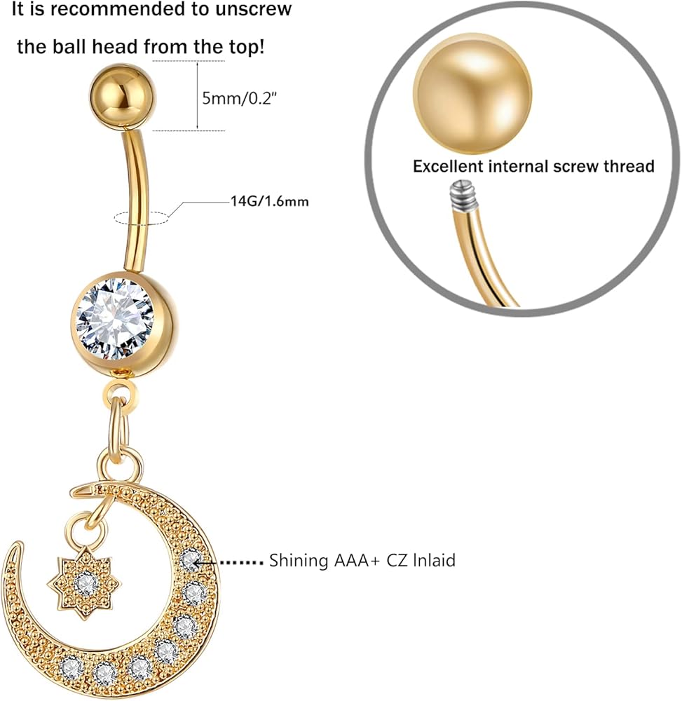 Material:Stainless Steel, Healthy and Rust-resistant, Get Out of the Agony Caused by Other Cheap Metal.Size:14G(1.6MM),Top Ball Diameter is 5mm, Common Belly Piercing Size.Excellent Internal Screw Thread, Firmly Screw on and Flexibly Screw off.,Won't Easy to Slip Off.