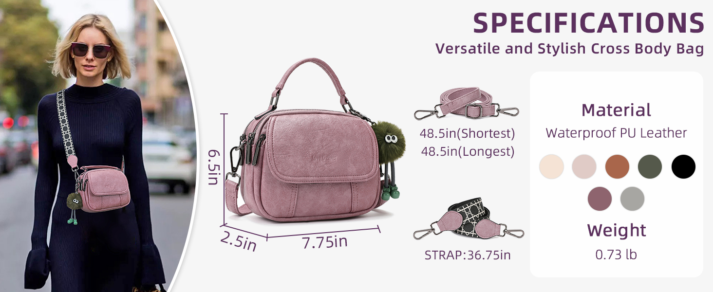 PRODUCT SIZE: The dimensions of this cross body bag purses for women are perfect, (L) 7.85in * (W) 3.54in * (H) 2.95in. Weight: 0.73 LB. The adjustable thickened shoulder strap make it easy to customize to your comfort. We also include one more free widened colorful strap and a cute plush toy, giving you multiple options to change up your look.