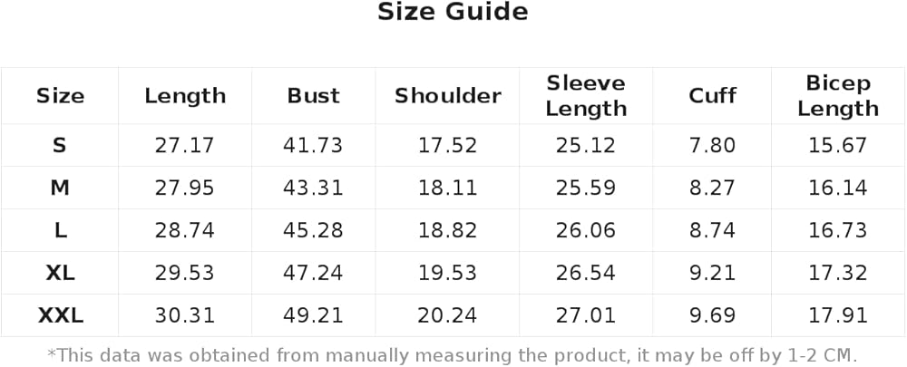 Large:Bicep Length:17.2IN,Bust:45.3IN,Cuff:8.7IN,Length:29.1IN,Shoulder:20.0IN,Sleeve Length:26.9IN