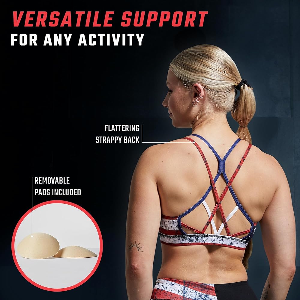 CUTE STRAPPY BACK: We've taken strappy and add another layer of straps in the bright colors of the USA flag – this criss-cross back women's sports bra looks great under an open back tank top