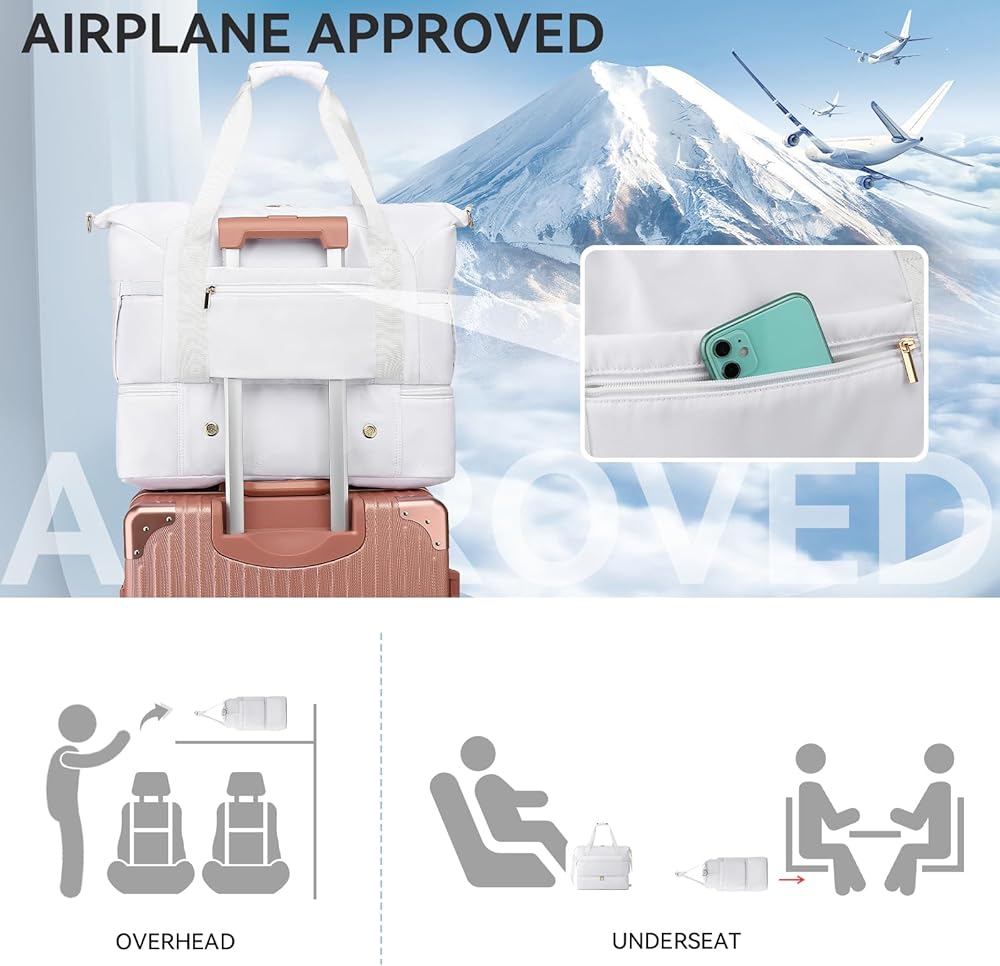 ✈ LARGE CAPACITY & CARRY ON DUFFEL BAG✈ Size: 18.50x14.17x8.66 inches. Our duffle bag has a capacity of 35L, which can hold 3-4 days of travel essentials. And it meets most international ccarry-on requirements, and can be placed in the overhead compartment or under the seat as a personal item in flight. The zippered pocket on the back can hold your smartphone, ID card or passport.