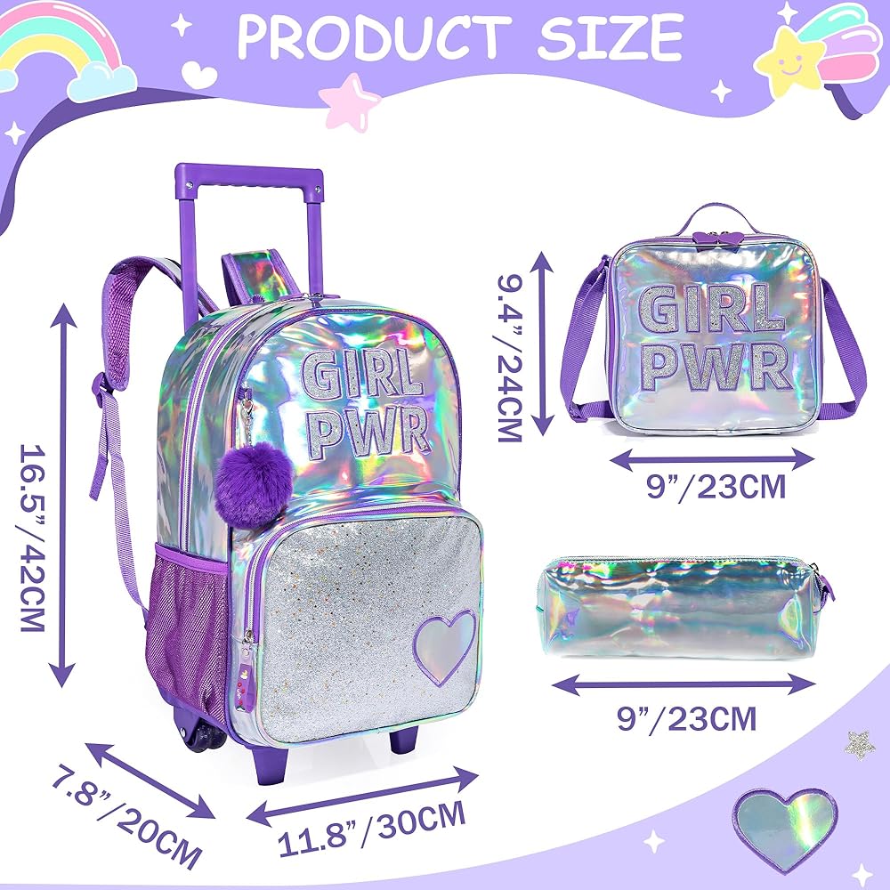 【❤Girls Rolling Backpack Size】The size of this girls rolling school bag is:16.5*11.8*7.8''Lunch bag size:10.2*9*3''Pencil bag size:9''.It is a three-piece trolley school bag that meets all the needs of children's daily schooling.
