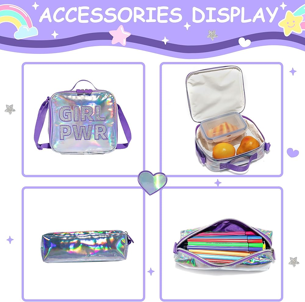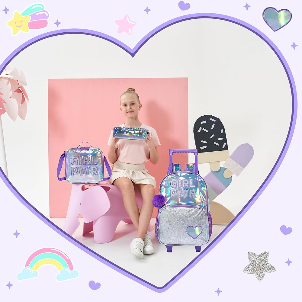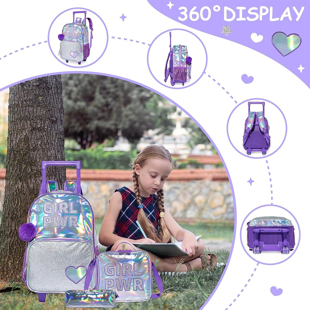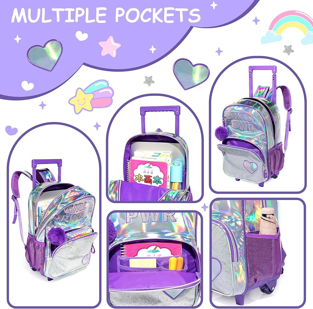 【❤Girls Rolling Backpack Capacity】There is a computer interlayer in the main bag of this trolley school bag. You can bring a laptop or tablet to school. The main bag is large enough to put blankets, clothes, books, folders, etc., and the front pocket can be used Put small items, stationery, chargers, earphones, snacks, etc., the lunch bag can be worn across the body, and the stationery bag can also be used to put pens, erasers, rulers and other stationery.
