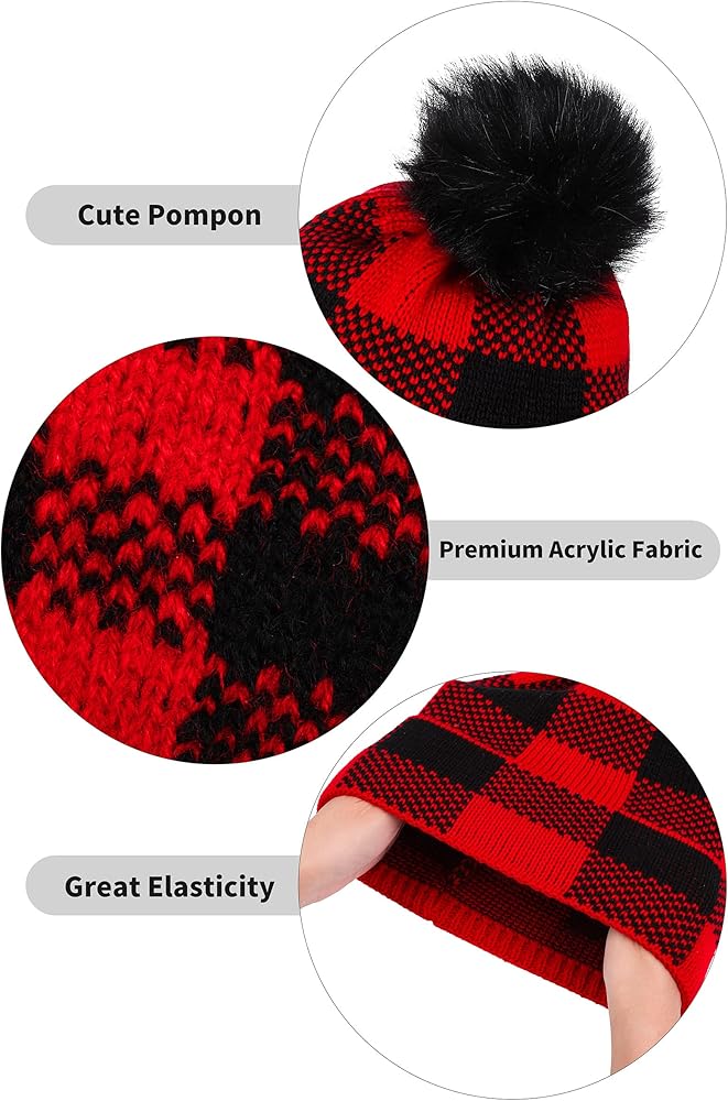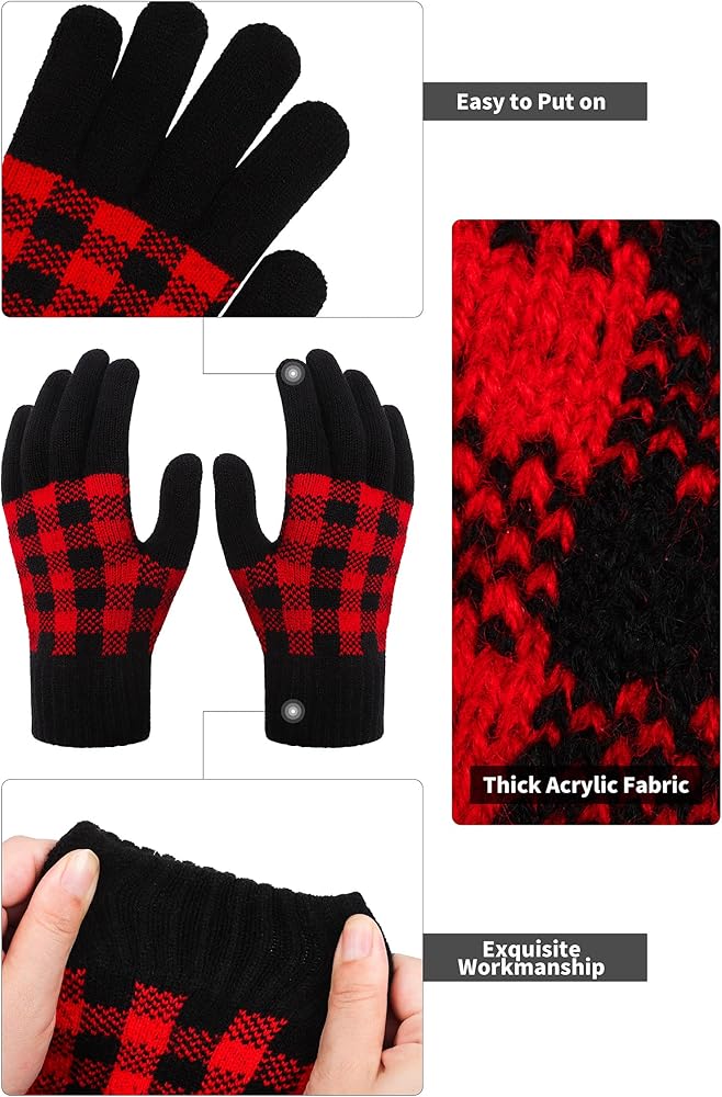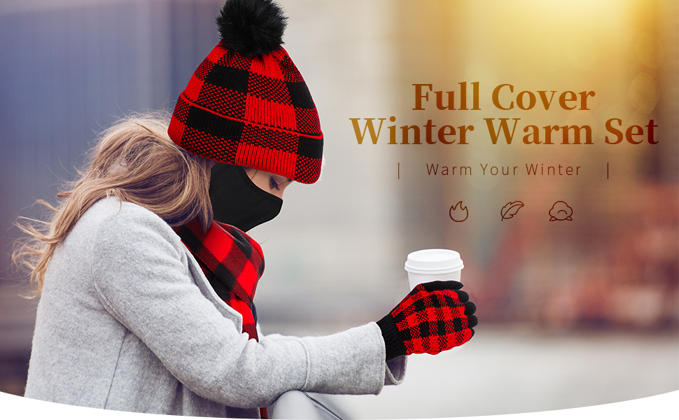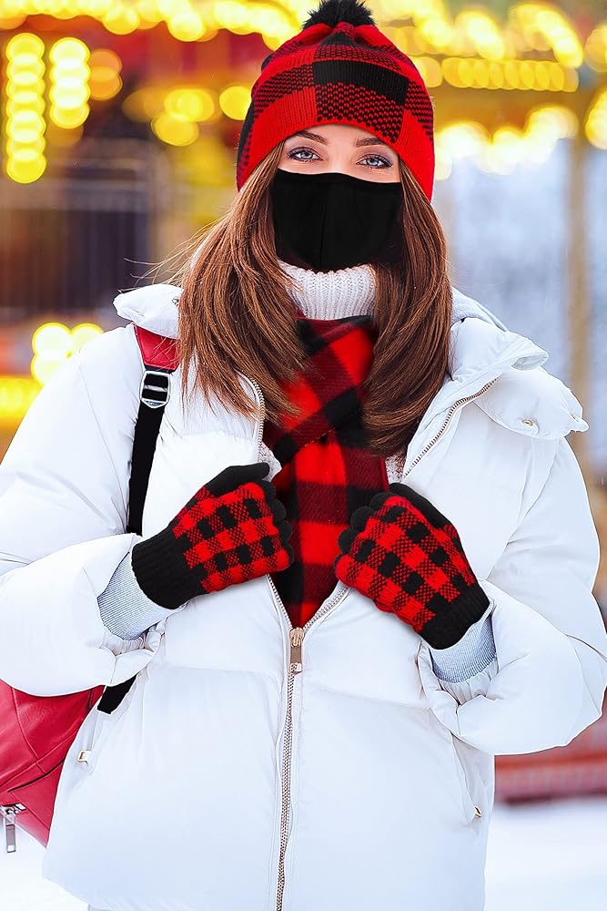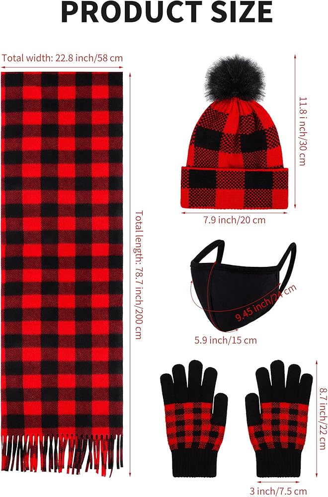 Packing includes: Our winter buffalo plaid thermal set has a red and black buffalo plaid scarf, a matching red and black buffalo hat with pompom, a pair of buffalo plaid gloves, and a black face cover, with our thermal set, you can enjoy a warm and cozy winter.