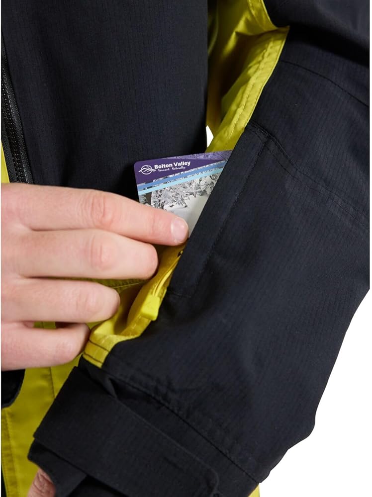 Interior mesh dump pockets, zippered chest pockets, zippered media/goggles pocket with therma-pocket inside to keep your device warm, zippered microfleece hand-warmer pockets, and zippered pass pocket for warmth and storage