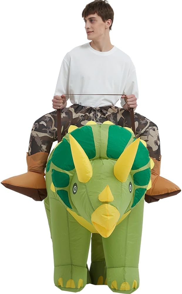 【Excellent Craftsmanship】 The triceratops costumes for Halloween are made of high strength waterproof polyester which is against rips and tears, the excellent stitching improves the durability of the inflatable costumes. Moreover, our costumes are providing with a powerful-duty blower to continuous airflow inflate the costumes.