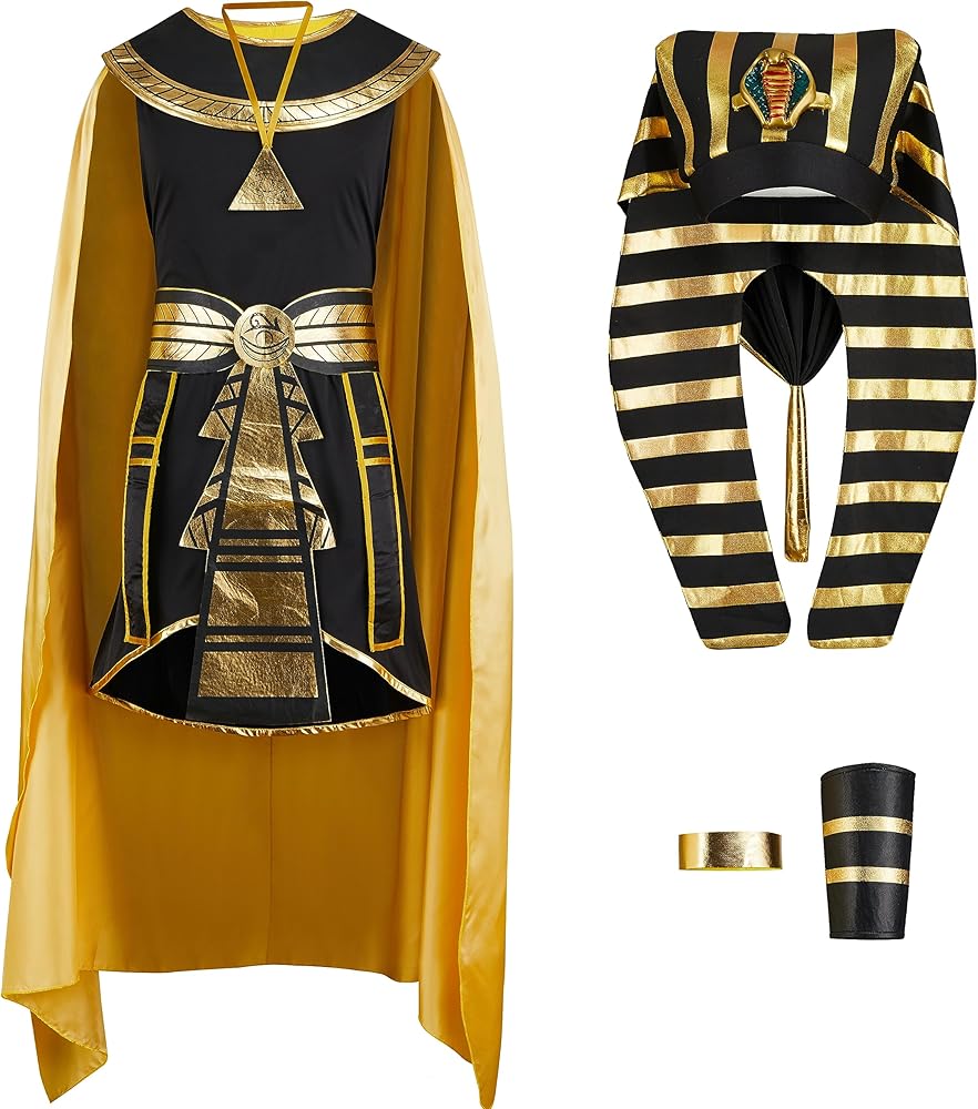 Super Value Pack: This King of Pharaoh Costume Deluxe Set includes 1 Hat, 1 Top, 1 Skirt, 1 Cape, 1 Pair of Wristbands, 1 Necklace , 1 Armlet, 1 Collar and 1 Belt, including everything you need to become the ancient Egyptian King