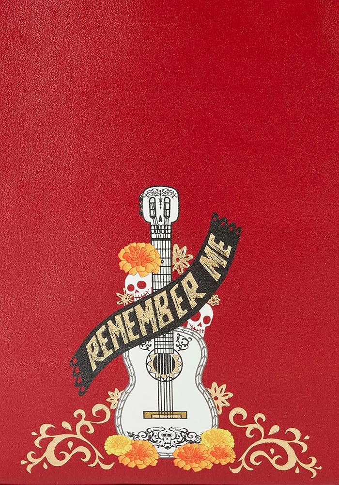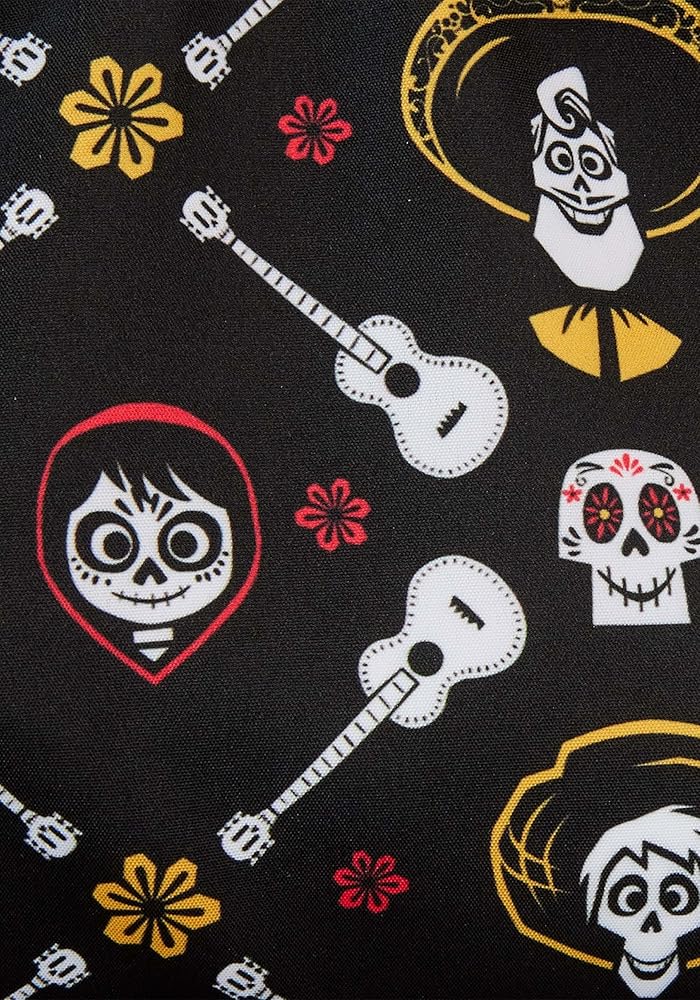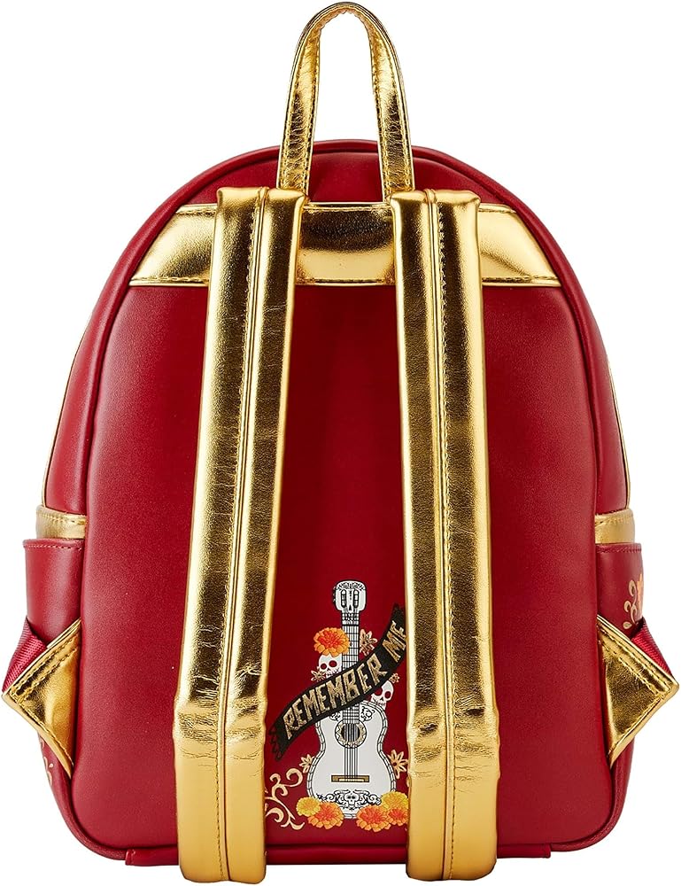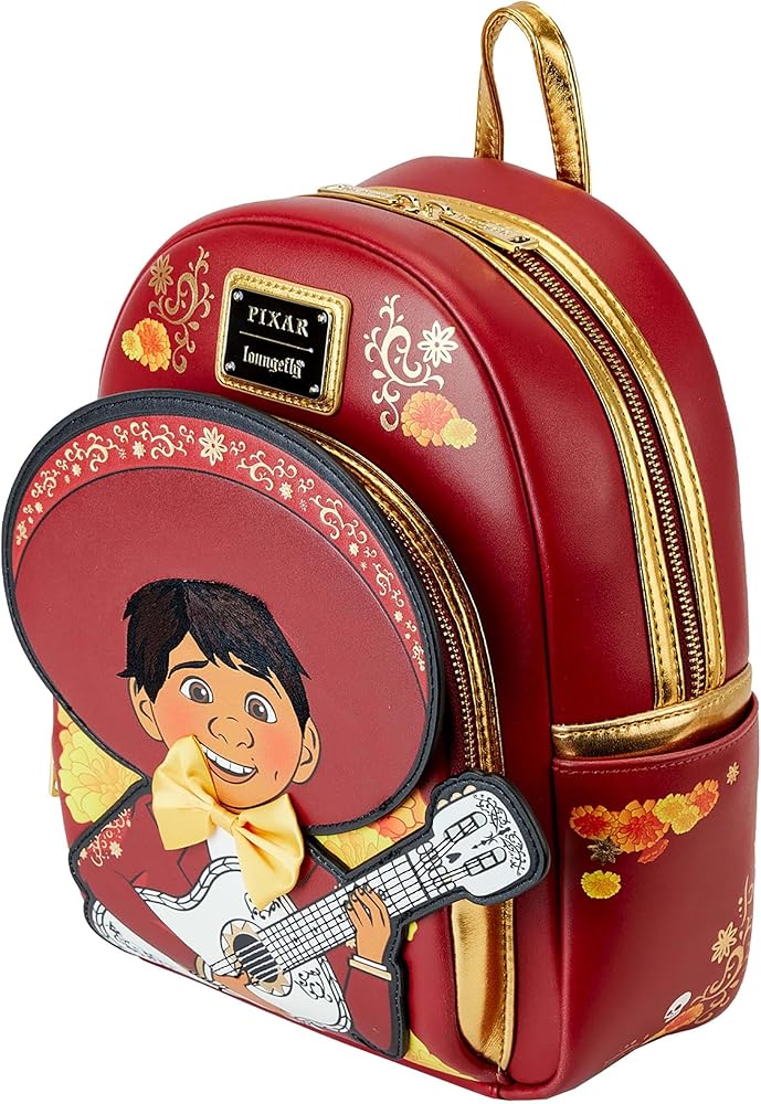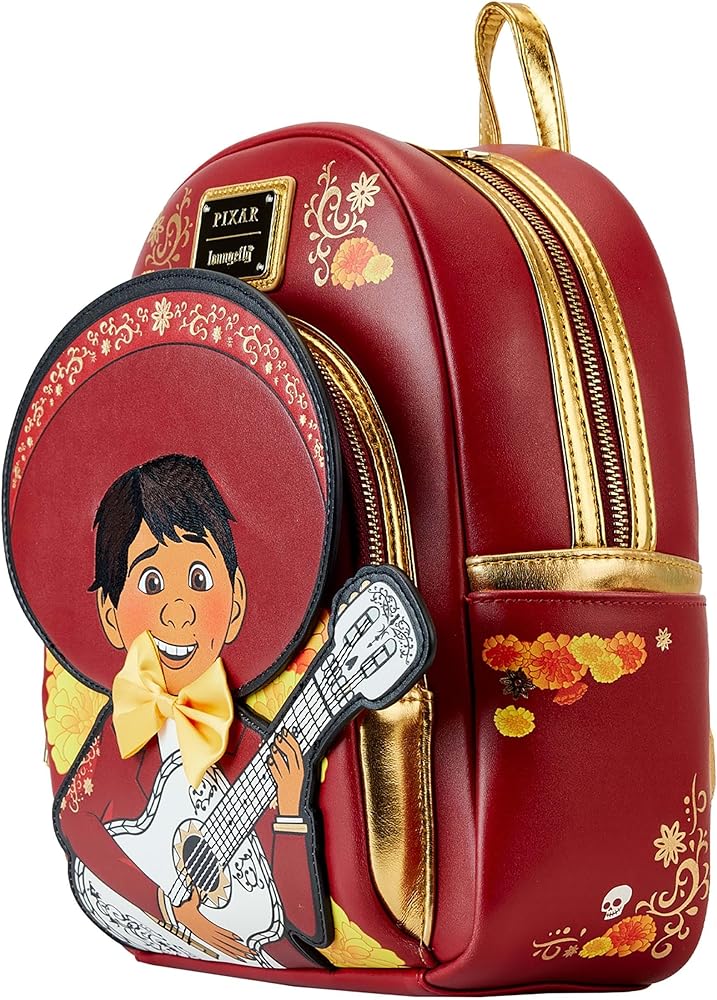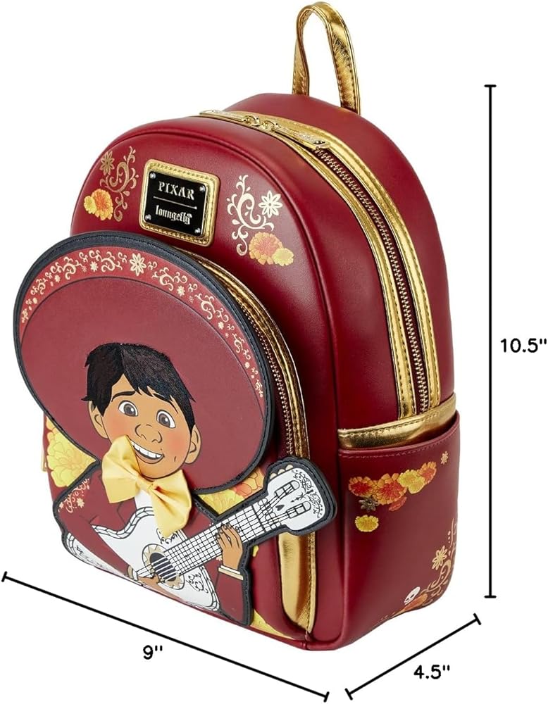 Move to a familiar beat in style! Our Loungefly Disney-Pixar Coco Miguel Cosplay Mini Backpack hits all the right notes. Disney-Pixar's Miguel comes to life on the front of the backpack in applique, embroidered, and gold metallic foil details. His guitar is beautifully replicated, and the necktie of his outfit is a real satin bow. Embroidered marigolds appear behind him, and a hidden zipper pocket allows you to secure smaller items during your travels. Even the side panels include festive marigold and sugar skull artwork. On the back, the guitar makes an encore appearance, with the words "Remember Me" written above. Strike a chord wherever you go and carry with you all your favorite memories. The Loungefly Disney-Pixar Coco Miguel Cosplay Mini Backpack is made of vegan leather (polyurethane). Bag has adjustable shoulder straps and gold-colored metal hardware. Additional features include applique, gold metallic foil, embroidered, real ribbon, and printed details. Take note of the coordinating inside lining. This backpack is an officially licensed Disney-Pixar product. Backpack dimensions: 9"W x 10.5"H x 4.5"D
