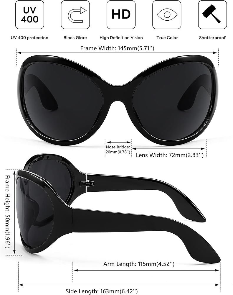 【Oversized Frame】: The Oversized Trendy Sunglasses' frame oversized design is basically suitable for all face shapes, whether your face is big or small with this sunglasses will have oversized effect, face shape small also do not worry, with sunglasses are not easy to fall off. Shades light weight, comfortable to wear.