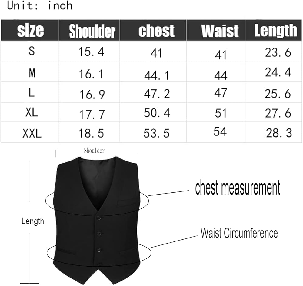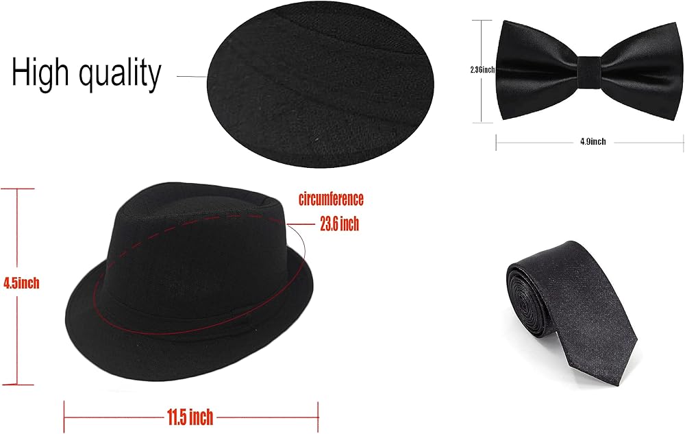 20s mens Costume size: The circumference of the hat is 23.6'', which fits most people. Bow tie size: 5.1''*2.4''. There are 5 sizes of vests for you to choose from, check the pictures for details.