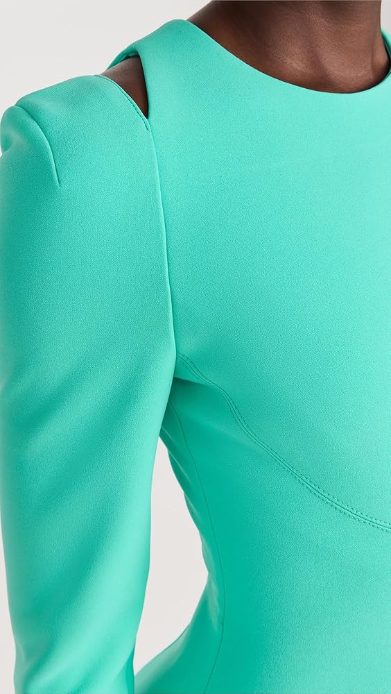 - Asymmetrical cutouts at shoulder and waist, Jewel neckline and long sleeves