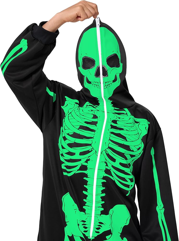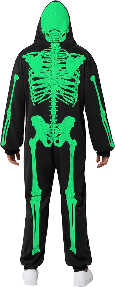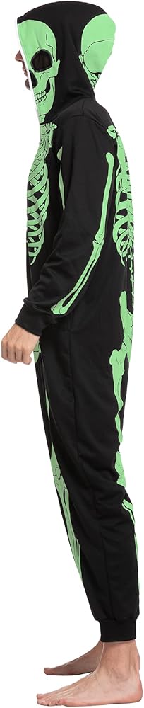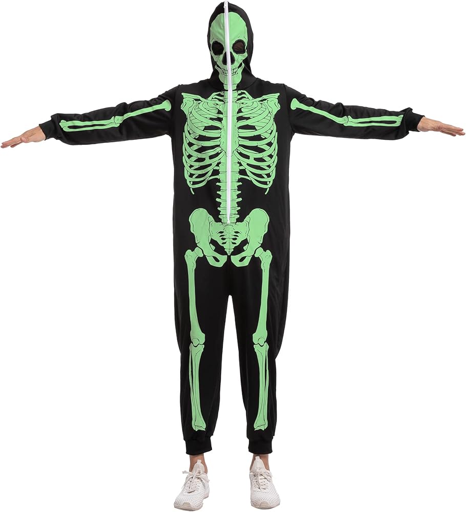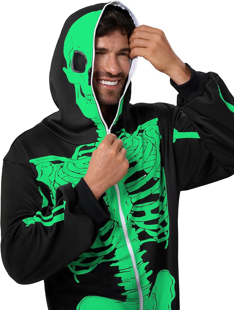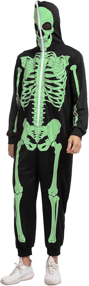 Our Skeleton costume includes 1 piece of Glow in the Dark skeleton themed jumpsuit sleepwear pajamas. Features a glow in the dark printed skeleton on the front and the back of the costume and a zipper that goes over the head. Easily wear the costume and get undressed.