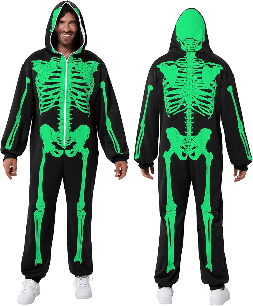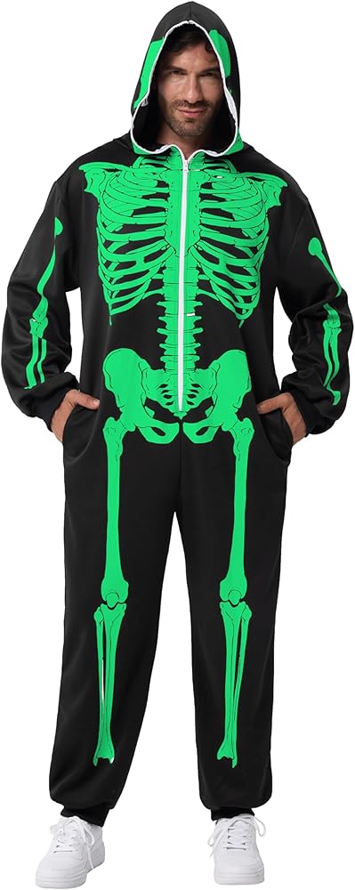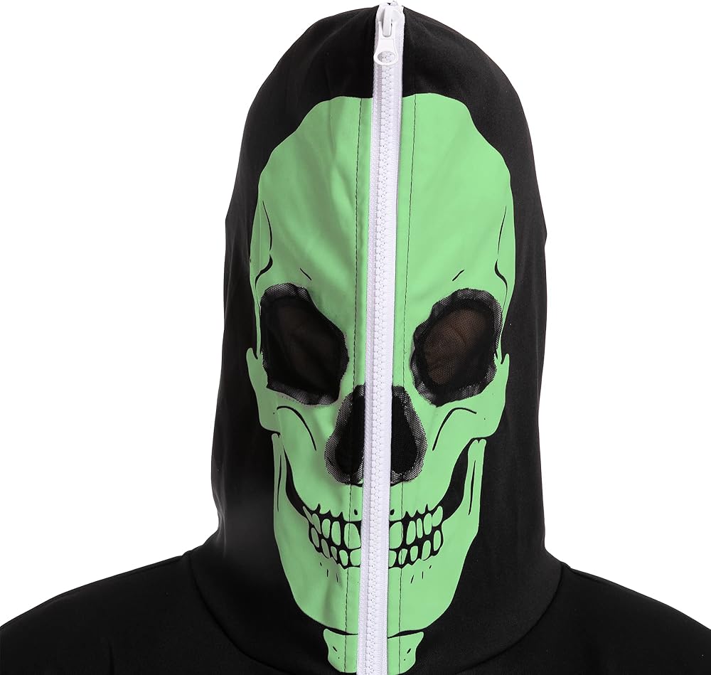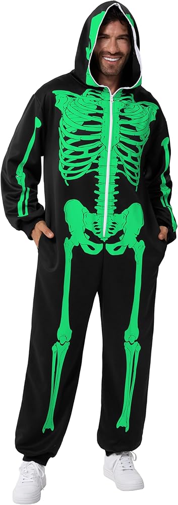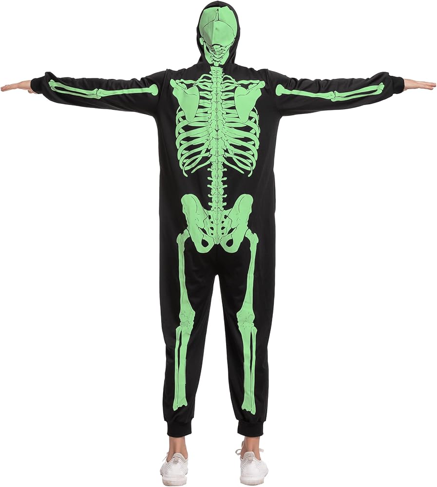 Our Skeleton costume includes 1 piece of Glow in the Dark skeleton themed jumpsuit sleepwear pajamas. Features a glow in the dark printed skeleton on the front and the back of the costume and a zipper that goes over the head. Easily wear the costume and get undressed.
