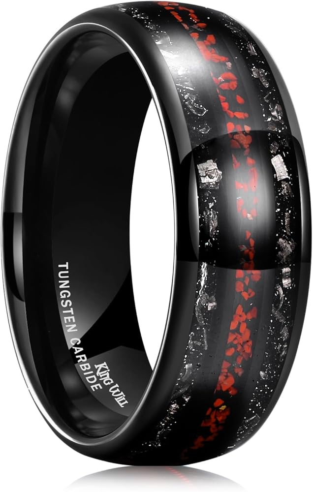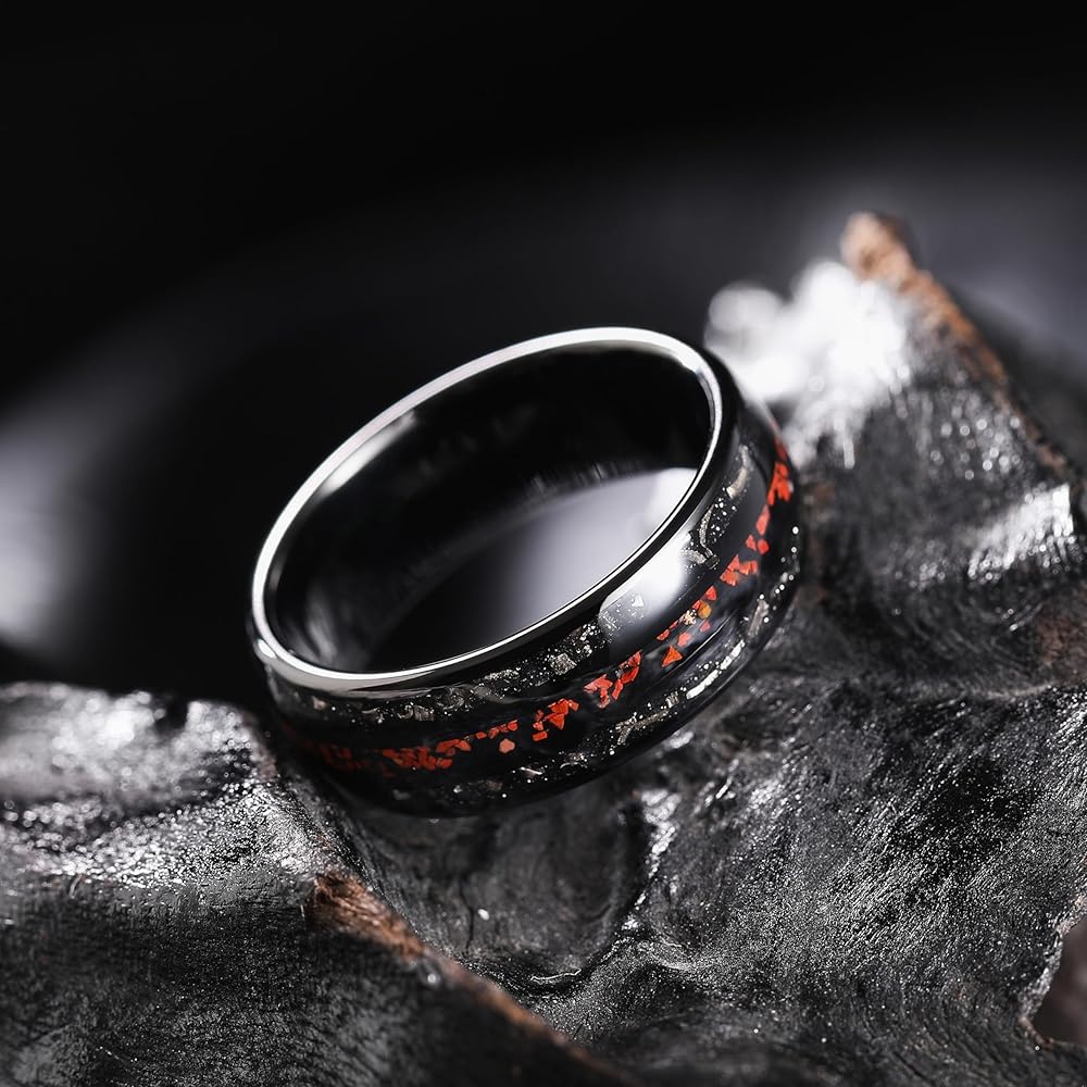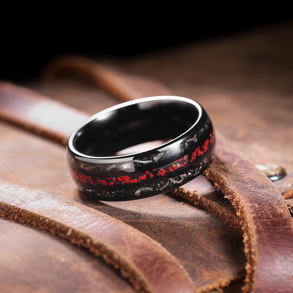 ✔️CLASSIC DESIGN: 8mm wide Tungsten Ring suitable for Men and Women with Multicolor Opal and Red Guitar String Inlay