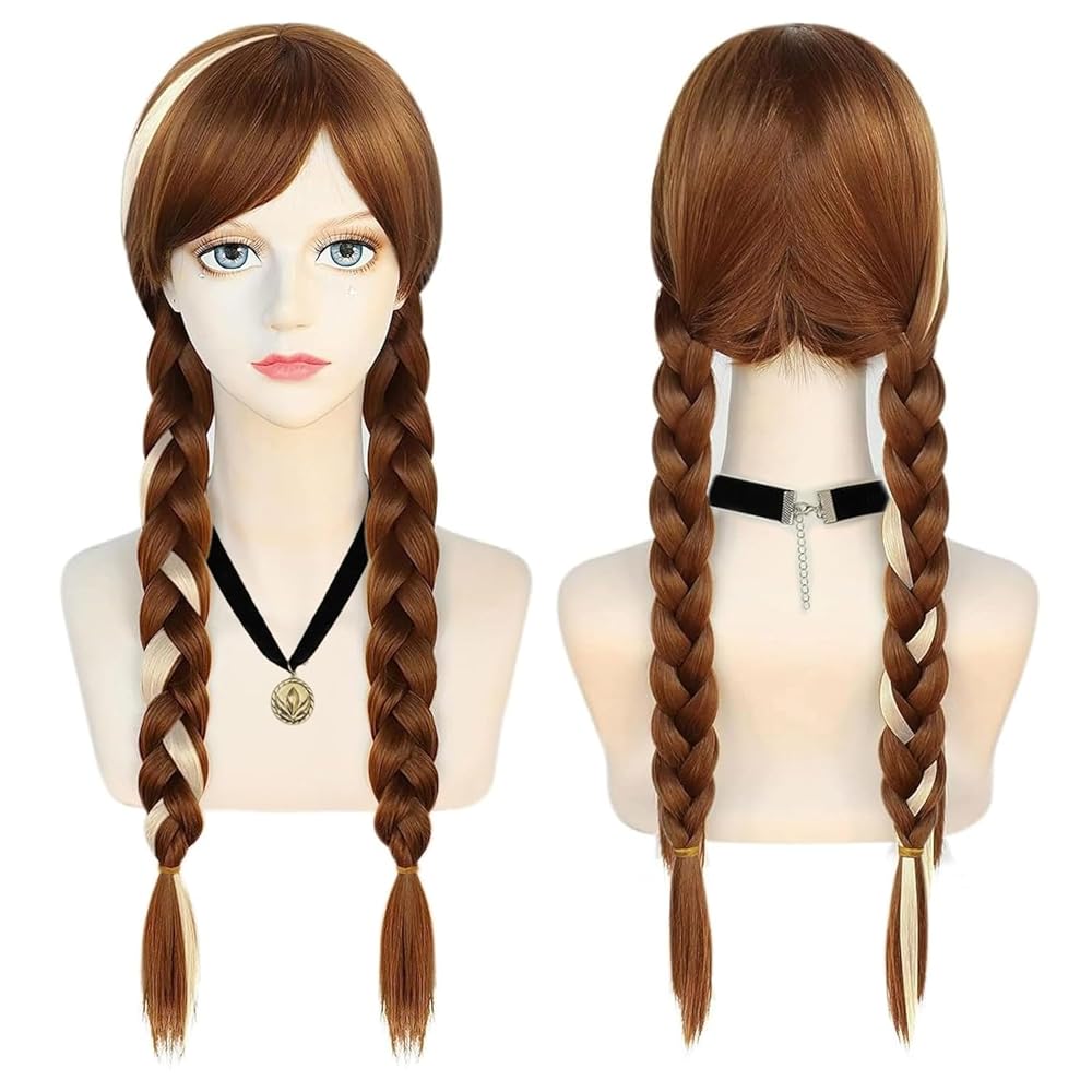 Description: Anogol Free Hair Cap+Brown Wig for Princess Long Braided Wig with Bangs Straight Cosplay Wig for Kids Party Halloween