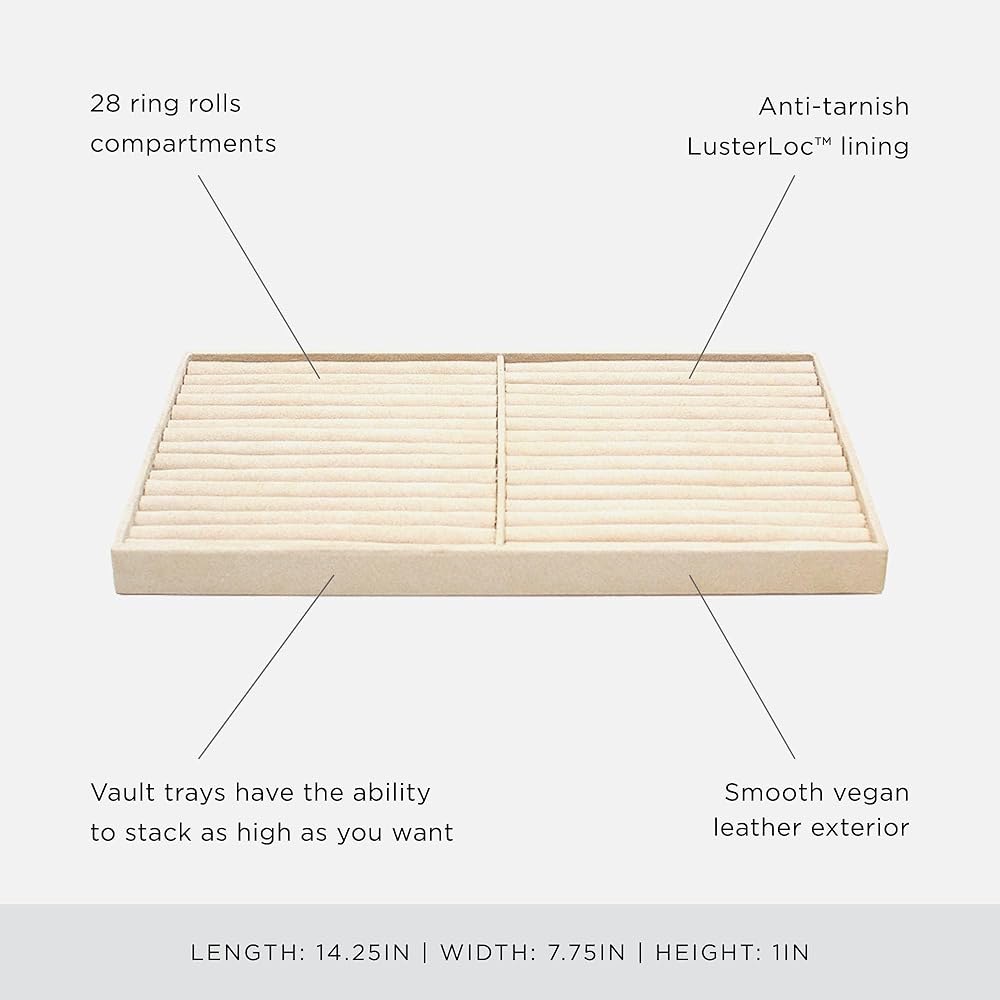 Beautifully organize and display jewelry with the vault tray ring insert. Insert fits into all vault trays and includes anti-tarnish LusterLoc lining and 28 ring rolls. Storage: 28 ring rolls LusterLoc: Allows the fabric lining the inside of your jewelry cases to absorb the hostile gases known to cause tarnishing. Under typical storage conditions, it can prevent tarnishing for up to 35 years.