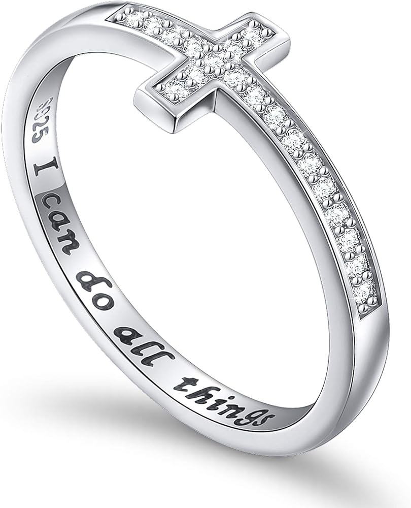 ♥Blessing in faith. With god all thing are possible. This sterling silver sideways cross ring engraved with the word “I can do all things”.Perfect inspirational jewelry for mother, sister, lover, girlfriend, wife, daughter