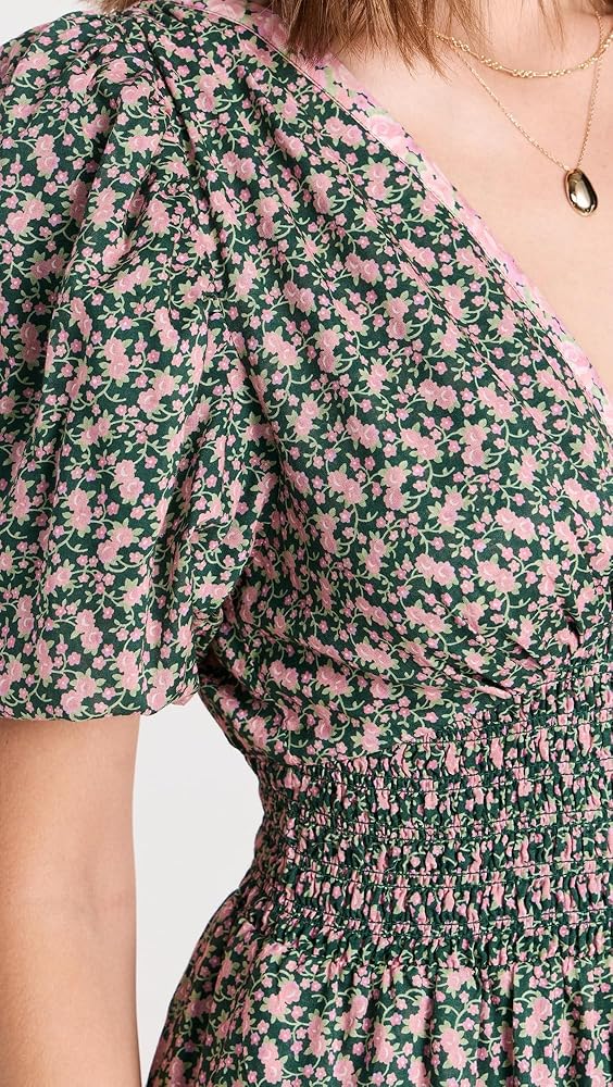 V neckline and short puff sleeves, Adjustable crisscross straps at back, Floral print