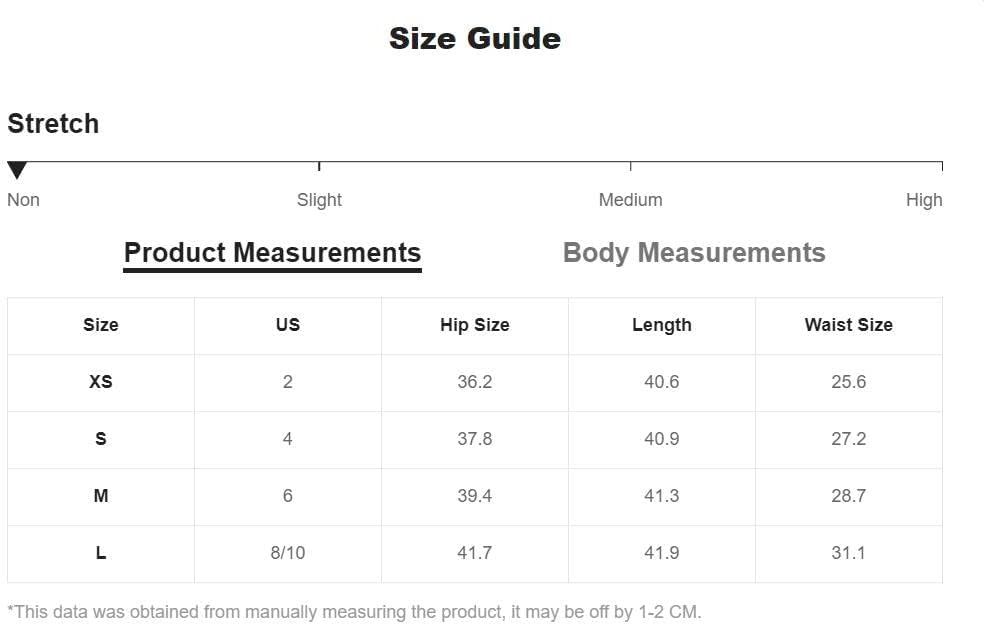X-Small: Hip Size: 36.2", Length: 40.6", Waist Size: 25.6"
