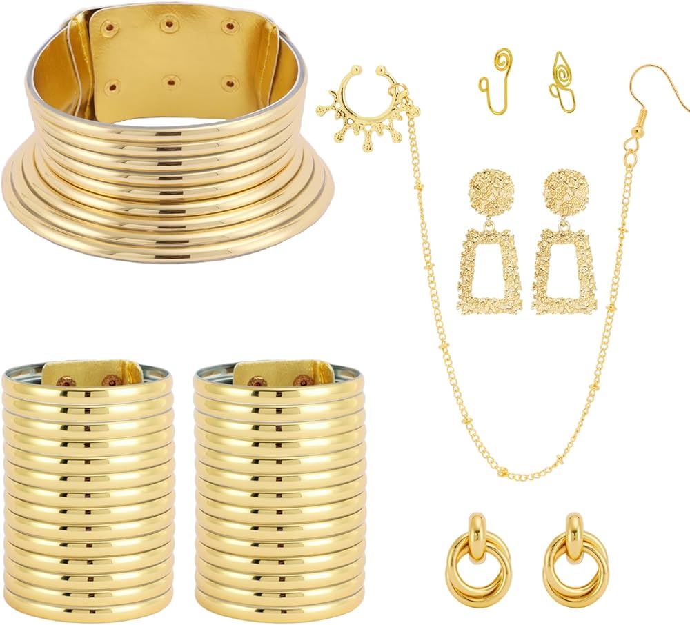 مجموعة المجوهرات الأفريقية: تتضمن مجموعة المجوهرات الوطنية الأفريقية للسيدات قطعة واحدة من قلادة قلادة، وزوج واحد من أساور الأكمام، وزوج واحد من حلقات الأنف، وزوجين من الأقراط الهندسية وقطعة واحدة من سلسلة حلقات الأنف، وهو ما يكفي لاحتياجاتك اليومية والاستبدال، يمكنك اختيار الإكسسوار الذي تفضلينه ليتناسب مع ملابسك.