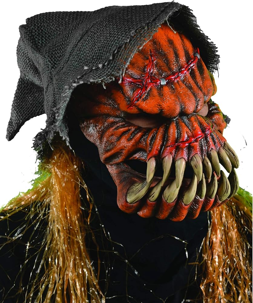 Moving mouth sock mask of an evil pumpkin with attached burlap scarecrow hat trimmed with raffia