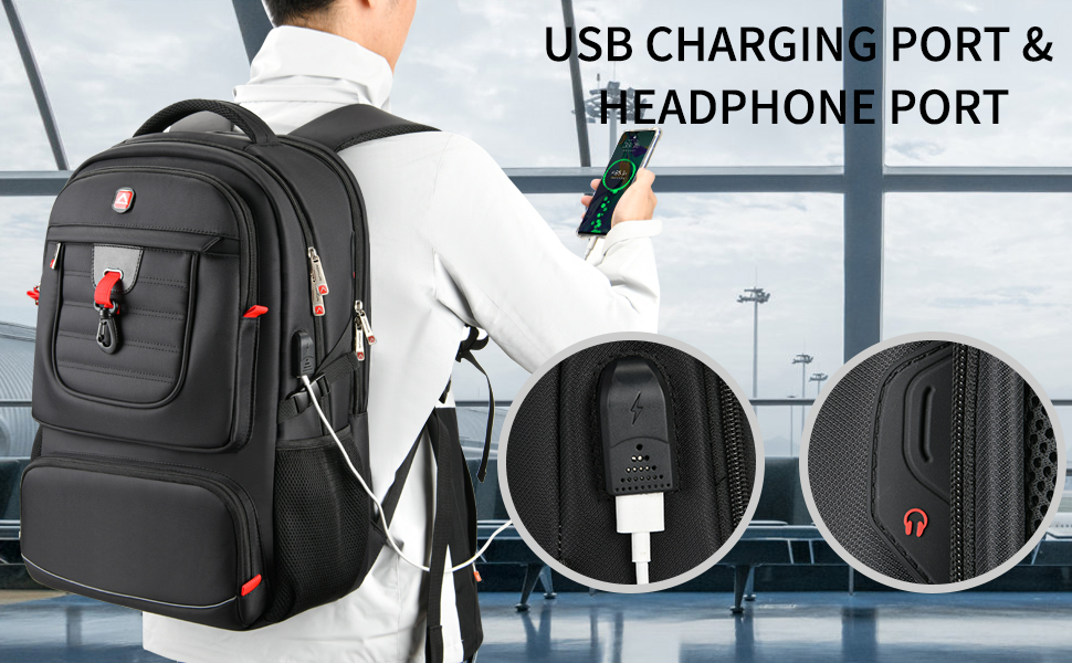 Convenient USB Charging Port & Headphone Hole: Charge your devices on the go with the convenient USB charging port and headphone hole on this heavy duty 17 inch laptop backpack for men. Made of waterproof and anti-wrinkle materials with reinforced stitching and a reflective strip for night travel.