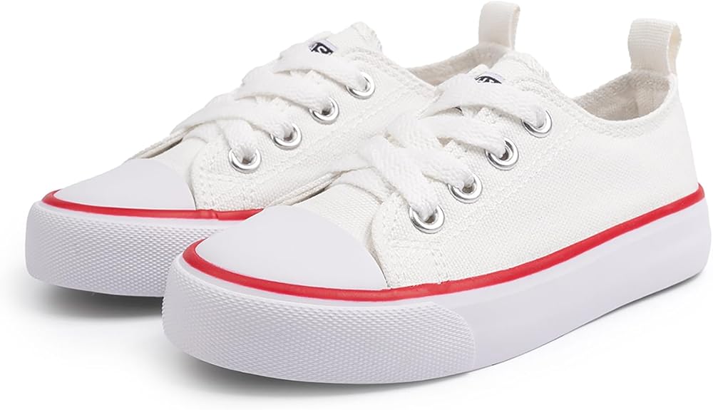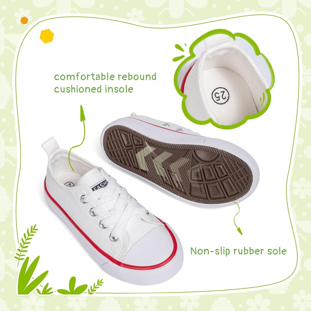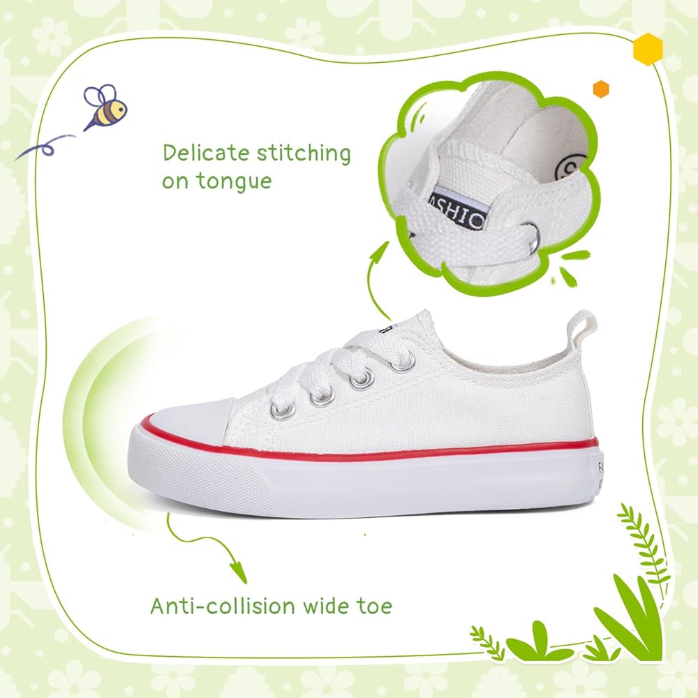 【COMFY&CONVENIENT】The upper is made of high quality canvas and the insole is made of flexible sponge without any ingredients that can harm your child's skin, providing a perfect experience for little feet.These kids canvas sneakers are very convenient,pull strap design can help child easily to slip on the shoes.