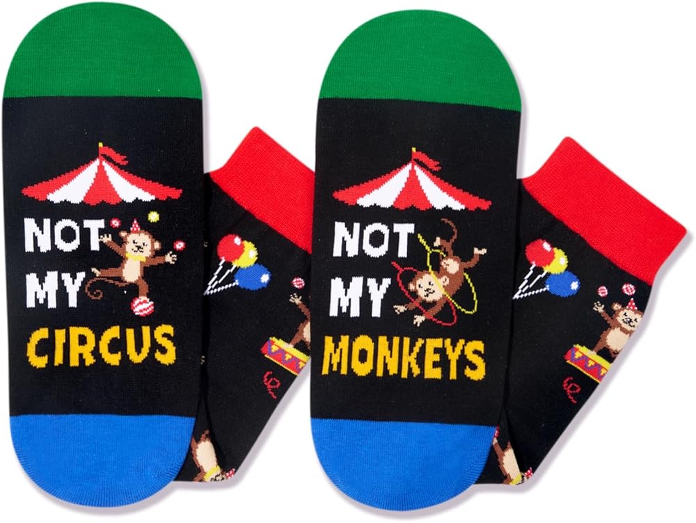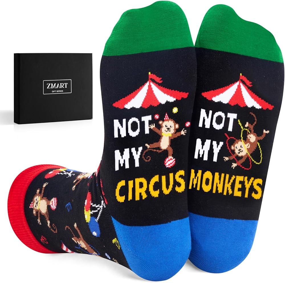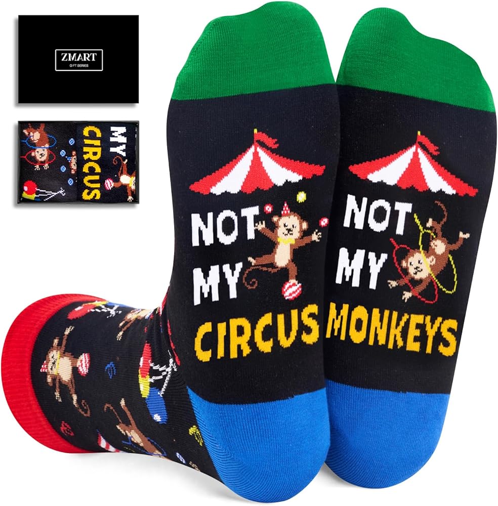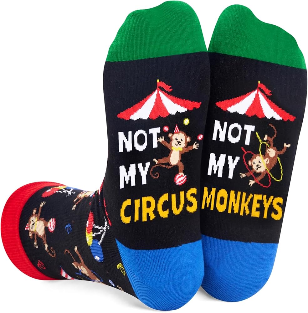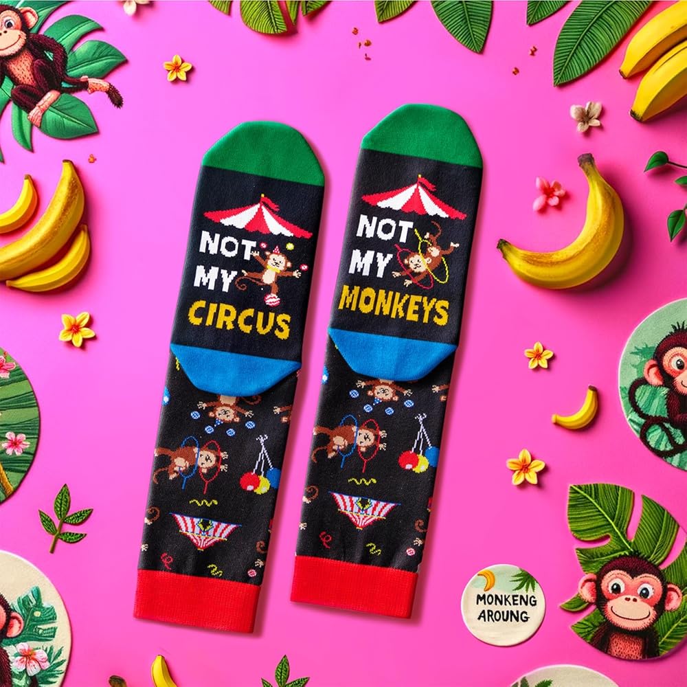 MONKEY SOCKS: Featuring a lively circus scene with naughty monkeys. These funny socks with sayings "NOT MY CIRCUS NOT MY MONKEYS" are perfect for both men and women.