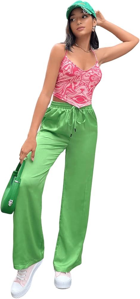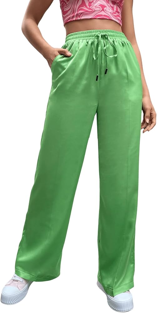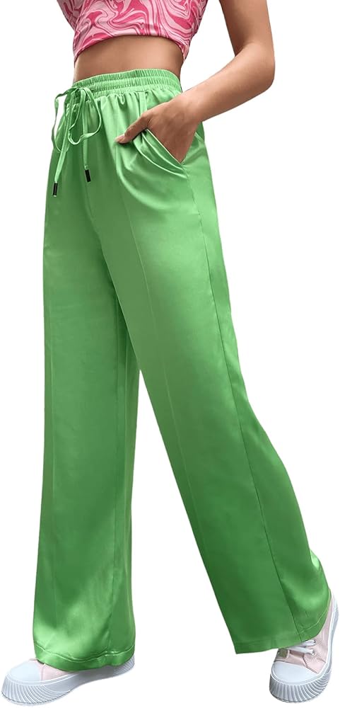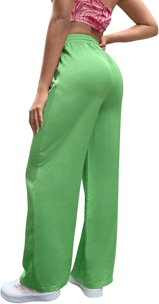 SweatyRocks Women's Wide Leg Satin Pants Casual Elastic Waist Loose Trousers with Pocket