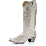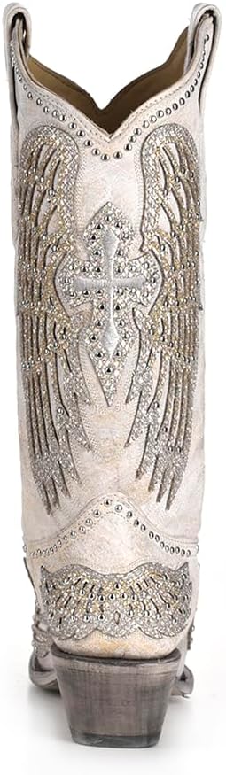 Classy crosses are here! This new show stopping boot from Corral is a must have style for your collection. This genuine leather boot features a glitter cross and wings inlay with stud and crystal accents. This think this boot has the WOW factor to pair with your wedding gown or to style with your denim for a chic western look! Please note that if you are ordering boots, the leather process and distressing is normal. Each boot is hand stitched and is individually unique. All our boots have been thoroughly inspected for true "defects" by the manufacturer and our staff. If you have questions about any pair of boots please contact our stylists for additional information.