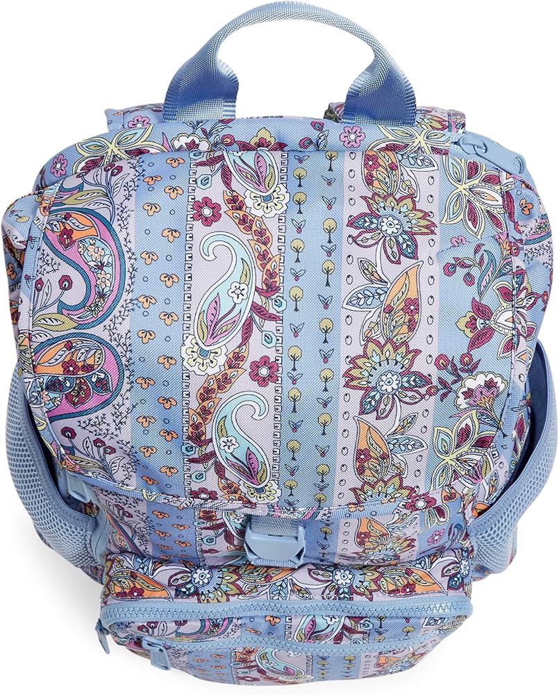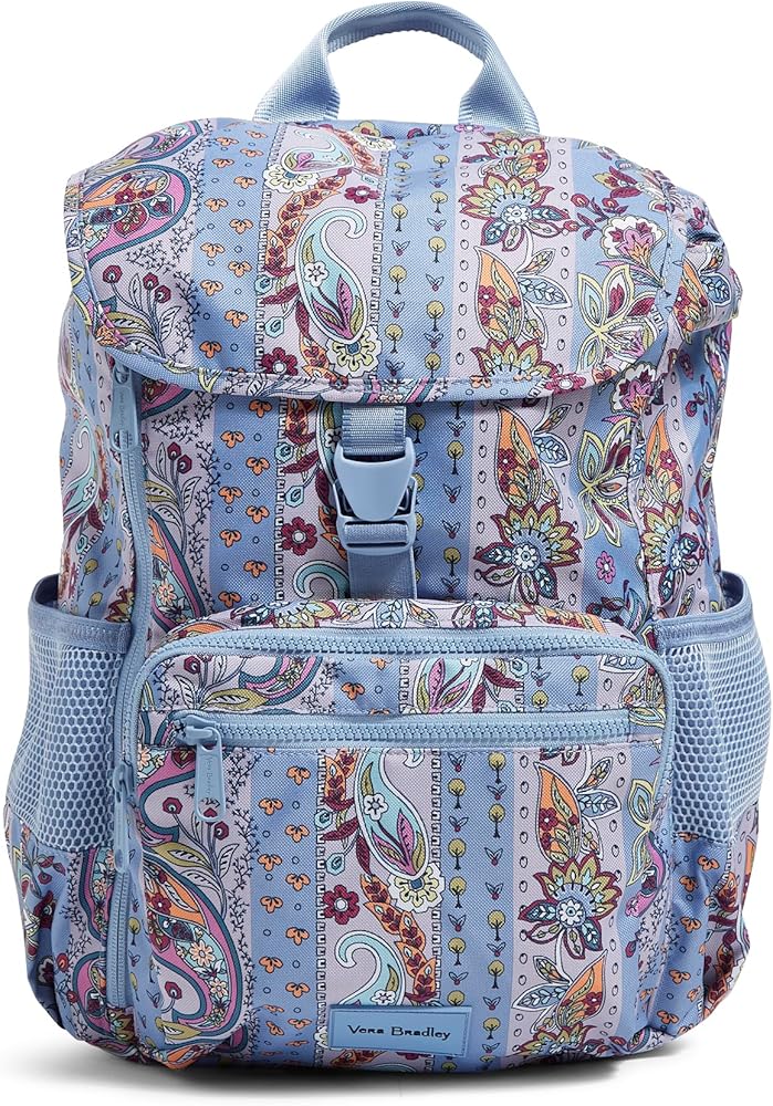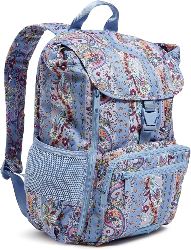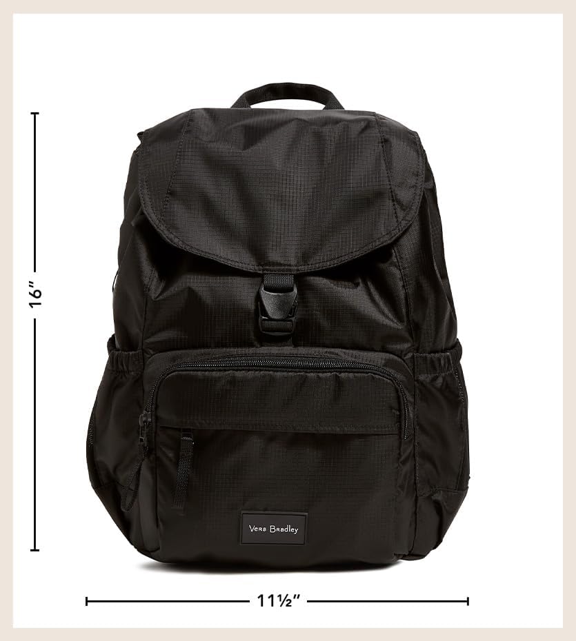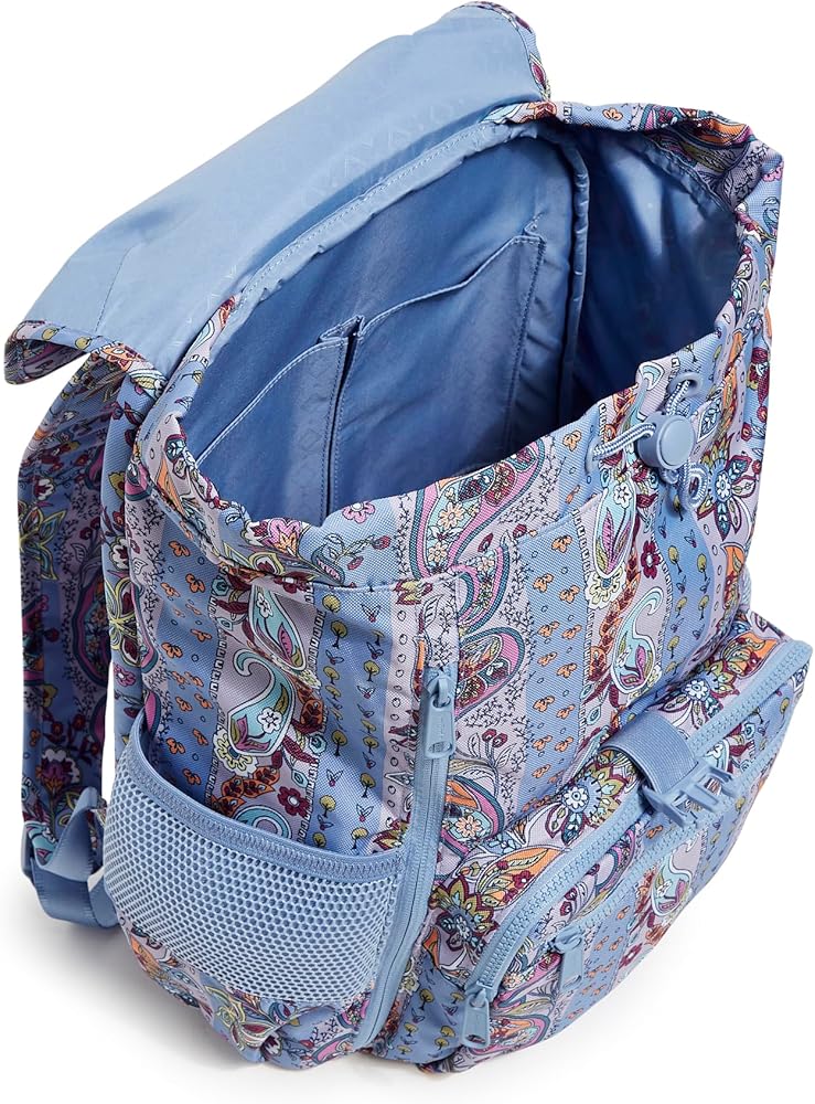 Vera Bradley is your back to campus destination! Our back packs are perfect for class, campus, work, and travel, including backpacks for men, backpacks for women, and backpacks for college. Our bookbags have plenty of organization, whether you are shopping for a large backpack or a mini backpack.. Exterior features three zip pockets (one with a slip pocket and four pen pockets) and two mesh side pockets. Padded laptop compartment. Trolley sleeve. Main compartment has two slips and a padded tablet sleeve. Drawstring, buckle and zip closures. Capacity 854 cubic inches (14 L).. Spot clean with mild detergent and a soft, damp cloth, rinse thoroughly; lay flat to dry