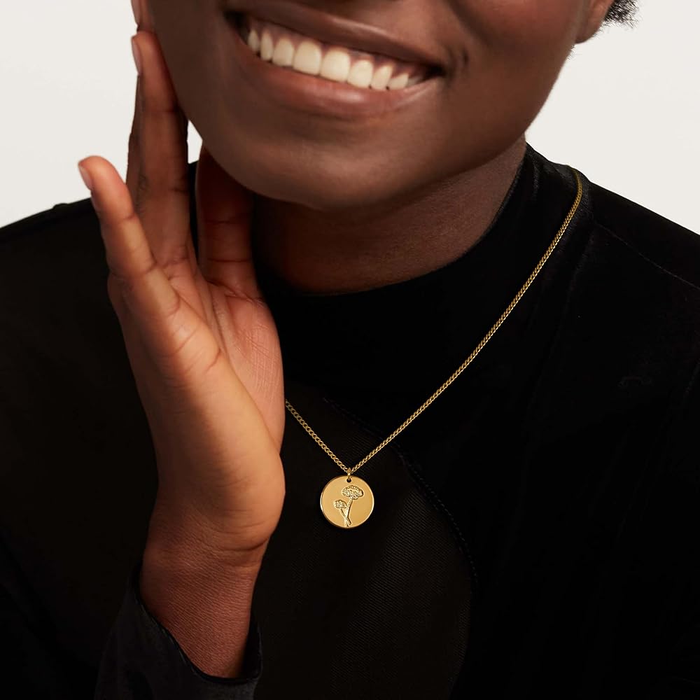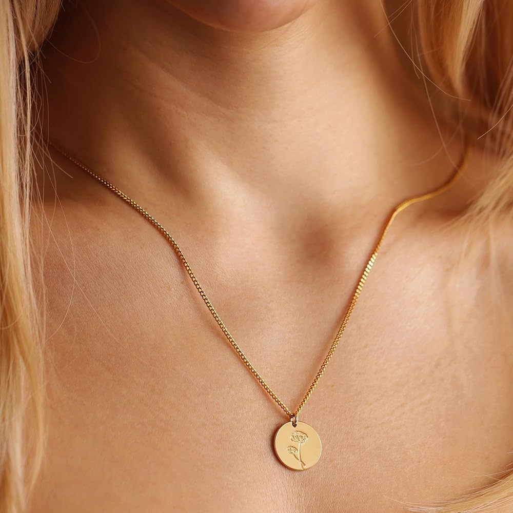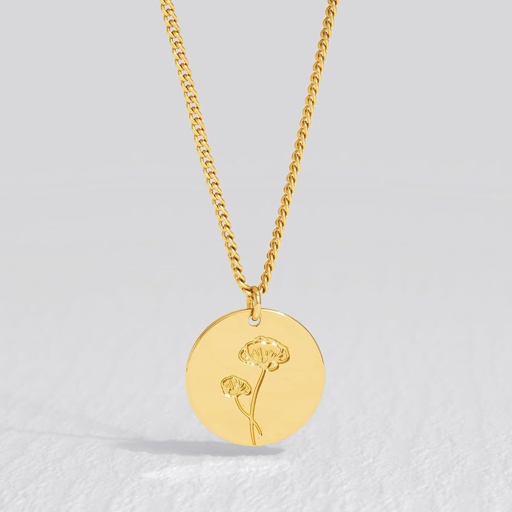 November Birth Flower Necklace: Chrysanthemum exemplifies well wishes and are believed to bring good luck, the gold 16mm coin birth flower necklace,dainty gold necklace with 2mm Cuban Link Chain Long 19.5"+2" extension, adjustable gold necklace suitable for most women and teen girls.