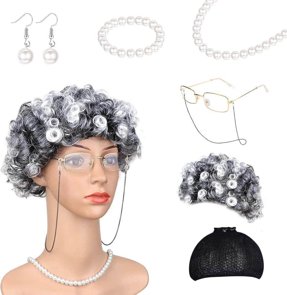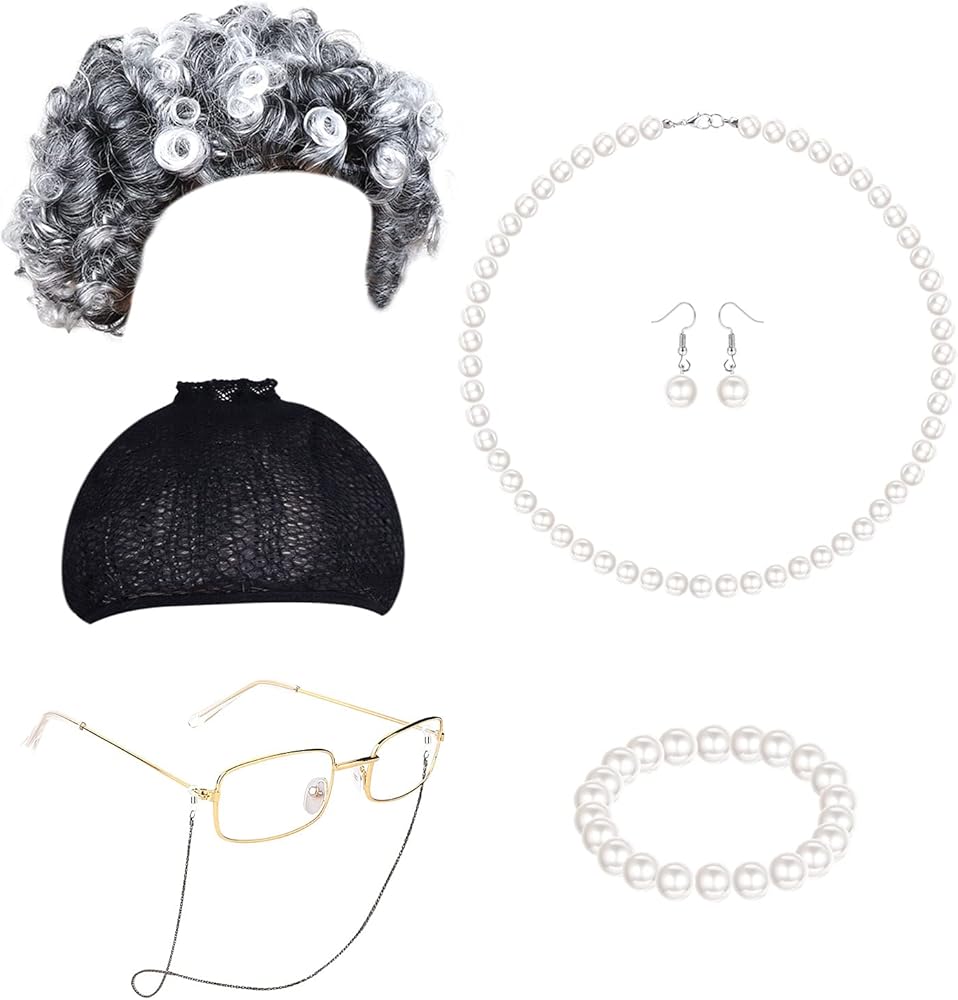 👵【Old Lady Wig Set】👓-- 8Pcs Old Lady Wigs for women In One Order, Including 1 x Grandma Wig; 1 x Granny Glasses; 1 x Wig Cap; 1 x Eyeglass Chains Strap; 1 x Faux Pearl Beads Necklaces; 2 x Faux Pearl Beads Earrings; 1 x Faux Pearl Beads Bracelet. A Big Gift Package Can Complete the Cosplay.