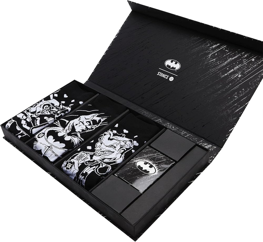 The Stance Batman Box Set socks will give you the style and comfort you need to protect Gotham or just kick back at your personal bat cave. Comfortable crew cut style sits at mid-calf height and feature a self-adjusting welt-cuff to keep socks in place. A thin, close fitted sock that is lightweight and breathable features seamless toe stitching for excellent in-shoe comfort. Y-stitch heel forms a cup around the heel for added comfort and helps reduce pull down and bunching inside your shoe. Box set includes gift box and three pairs of socks. 52% combed cotton, 25% nylon, 19% polyester, 4% elastane. Machine wash, tumble dry. Imported.