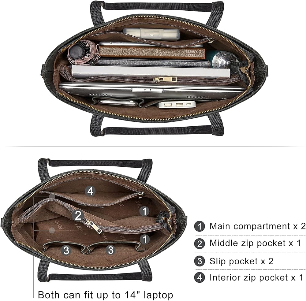 【Fits up to 14" Laptop】:1 x Front Magnetic Pocket; 1 x Back Zipper Pocket (fits up to 7.9” Pad) 6 Interior Pockets: 2 x main compartments (fit up to 14" LAPTOP) and 1 middle zippered compartment; 2 x slip pockets and 1 x zippered pocket