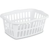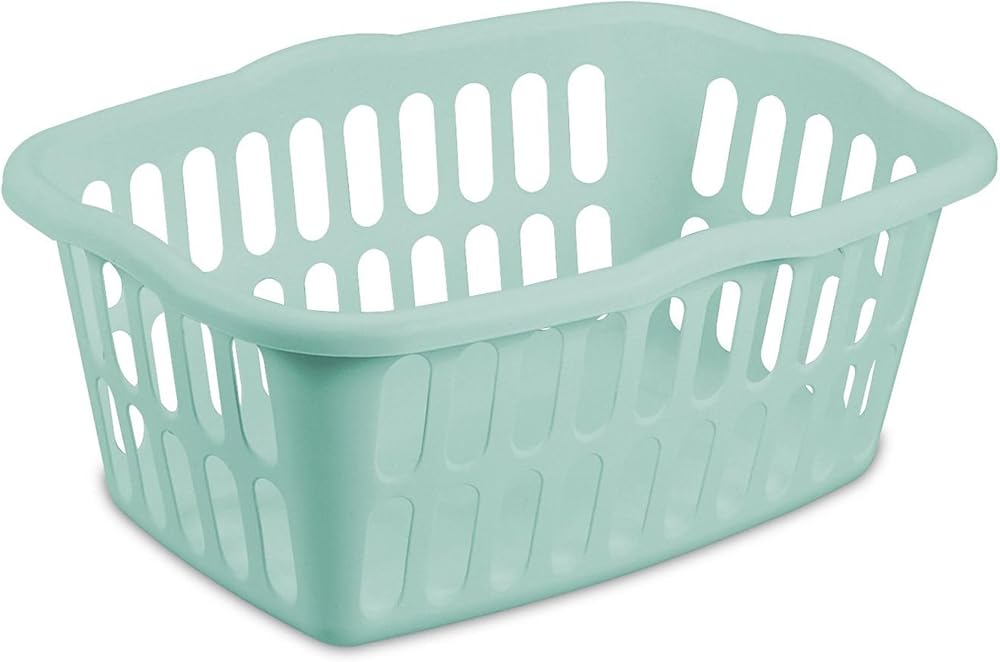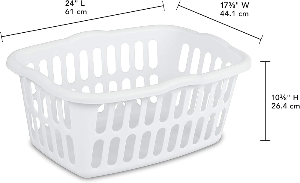 Make laundry day easy with these Sterilite 1.5-Bushel Laundry Basket. With a generous 1.5-bushel capacity, these laundry baskets make it easy to carry, sort, and fold clothes, towels, and sheets. This package includes 24 laundry baskets: 12 white, 12 aqua. These large laundry baskets have wide, rectangular openings for comfortable loading and unloading of large amounts of laundry. The laundry baskets feature contoured grip surfaces that add comfort and ease when carrying loads of clothes to and from the laundry room. The integrated handles on all 4 sides allow for easy lifting and carrying through doorways, hallways, and up and down stairs. When not in use, the laundry baskets stack neatly and nest together for compact storage. The large, oval hole pattern increases air flow for added ventilation and matches any home decor. Overall, each plastic laundry basket measures approximately 24 inches long, 17 inches wide, and 10 inches tall.