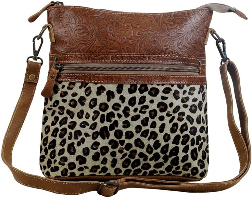 {Lightweight Canvas Purse} Myra Women's Dynamic Leopard Print Bag is perfect for those who want to add an extra touch of style. The canvas bag is lightweight and features a leopard print design with a brown leather accent. This shoulder bag is the perfect statement piece for any outfit.
